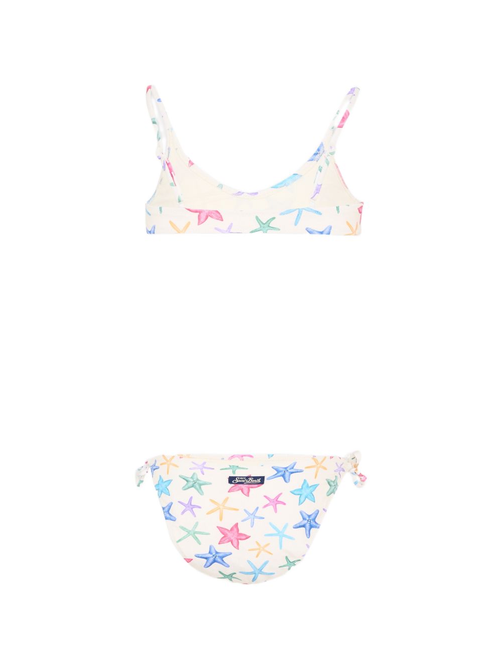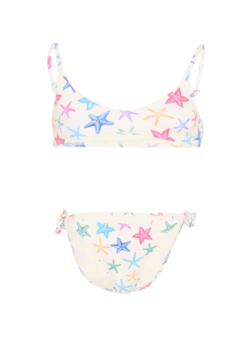 Bikini beige con stampa a stelle marine, dettaglio con laccetti.
