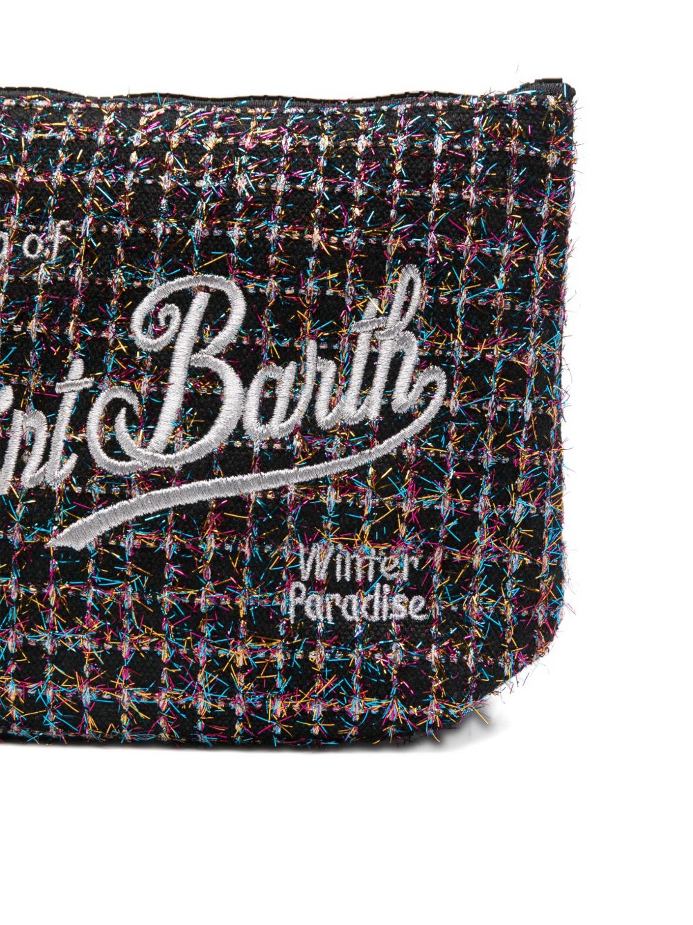 Borsa con cinturino da polso con chiusura a zip e logo ricamato in tweed nero/multicolore
