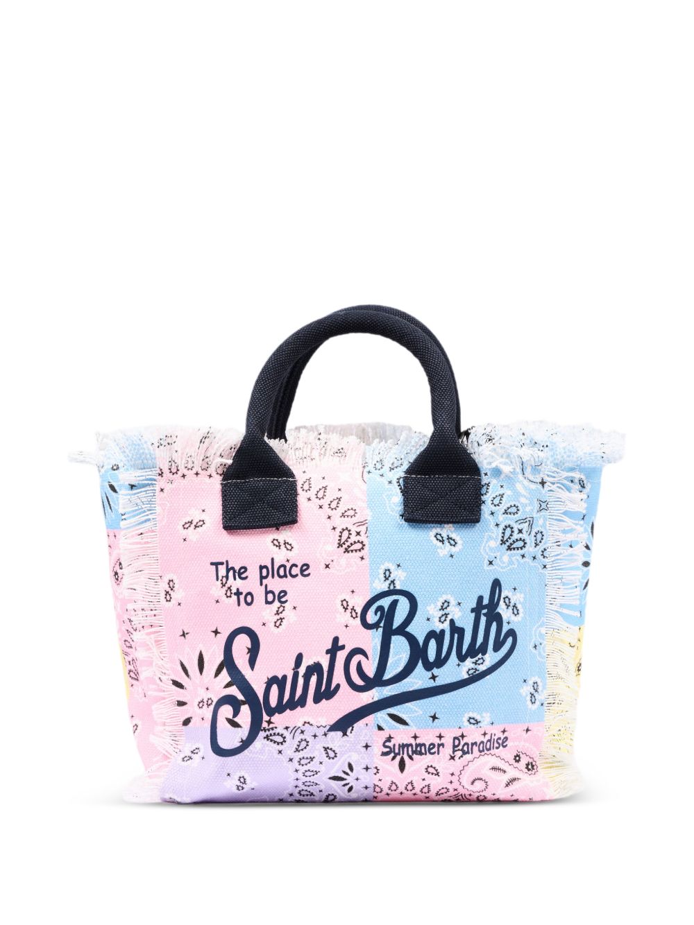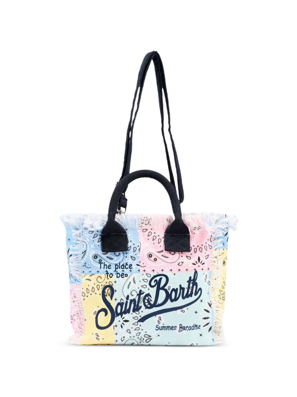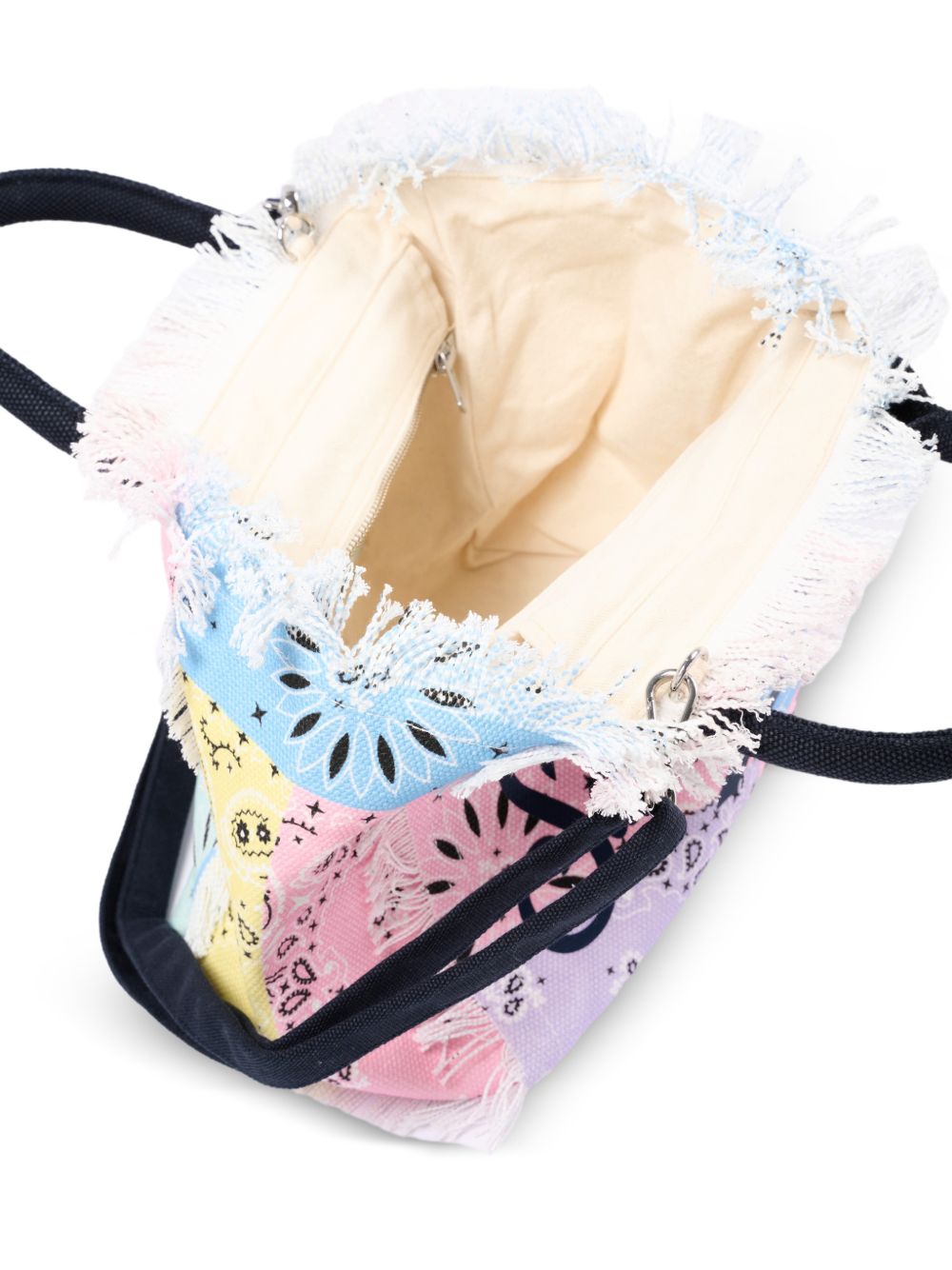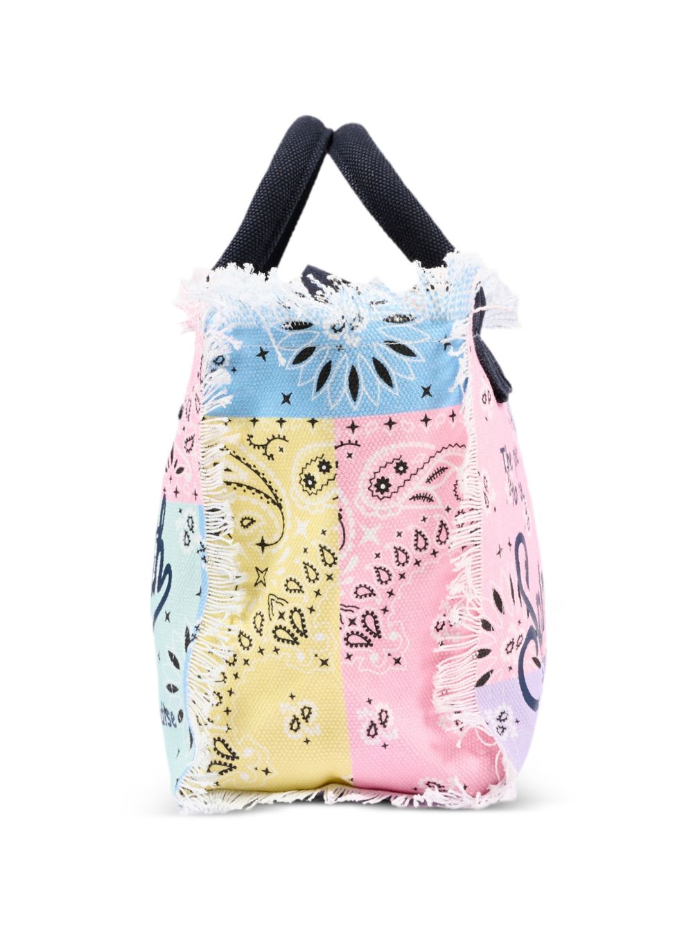 Borsa rosamulticolore, stampa bandana, manico, bordo sfilacciato.