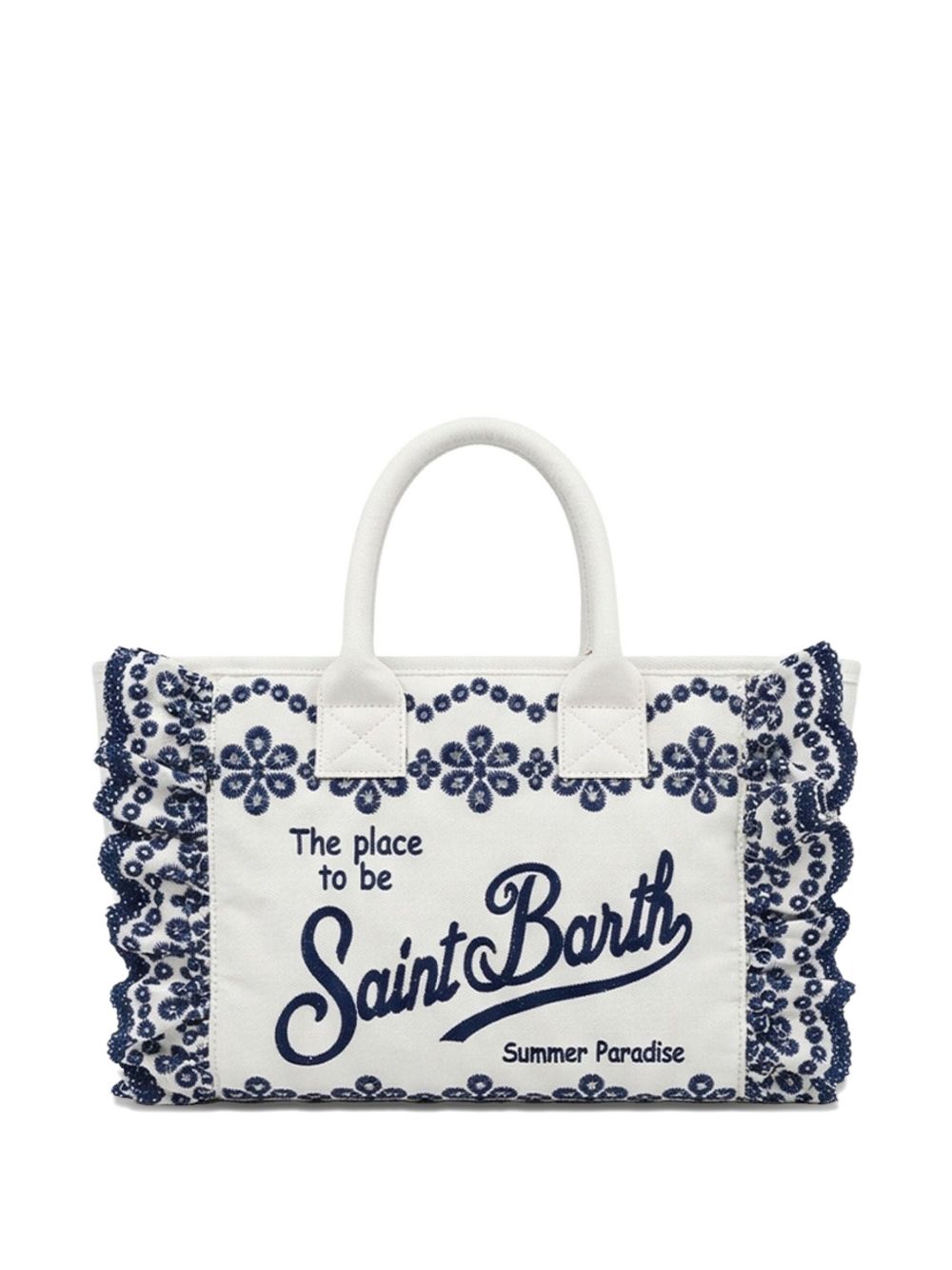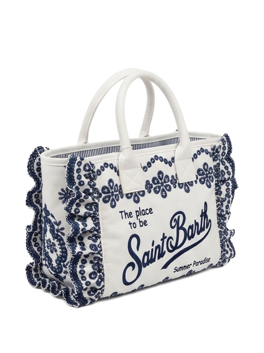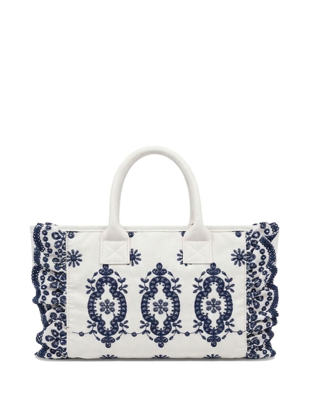 Borsa in cotone bianco con ricami anglaise, finiture a volant, stampa del logo sul davanti, due manici superiori, tracolla regolabile.