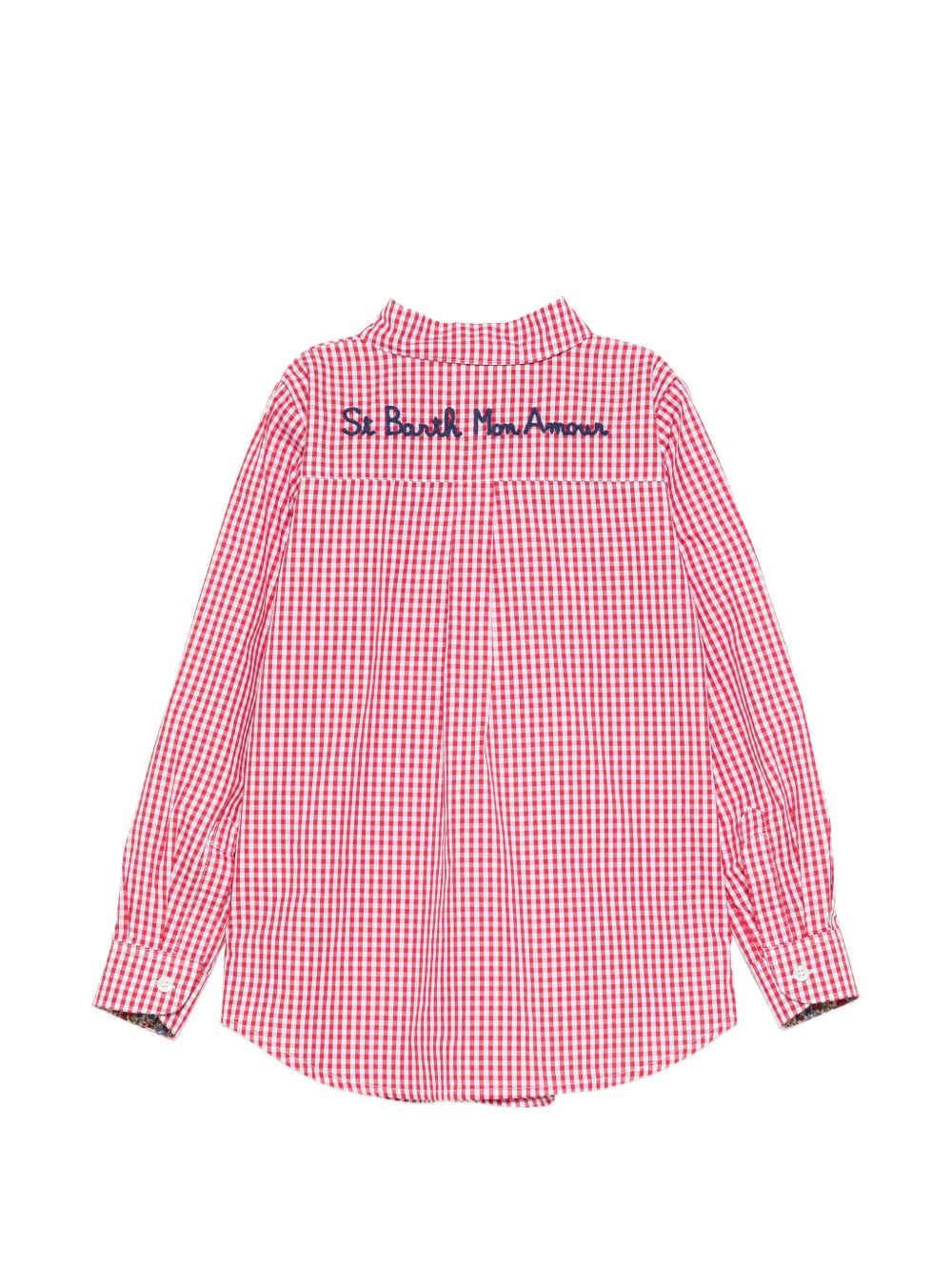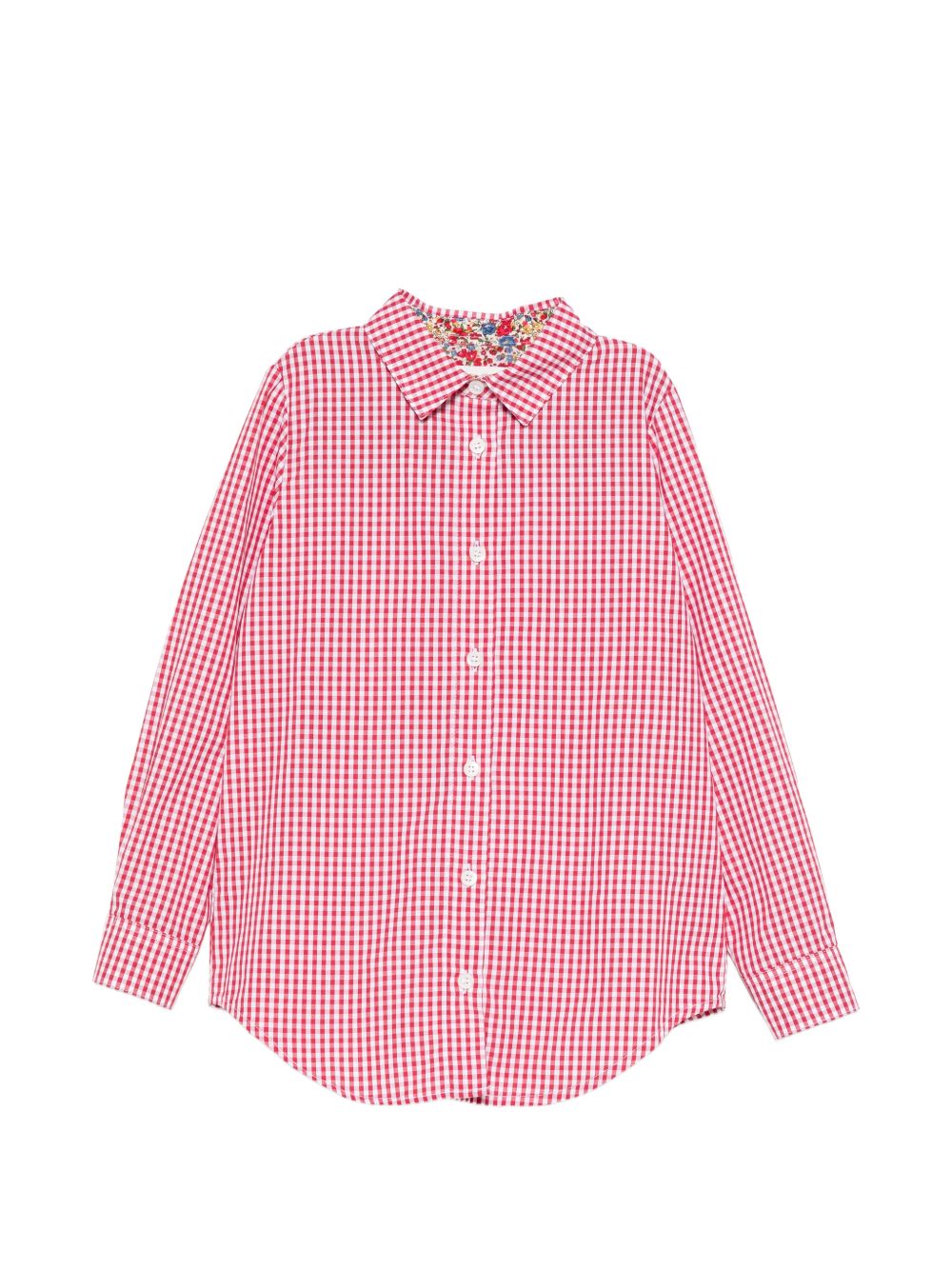 Camicia rossa e bianca, maniche lunghe, dettaglio logo.