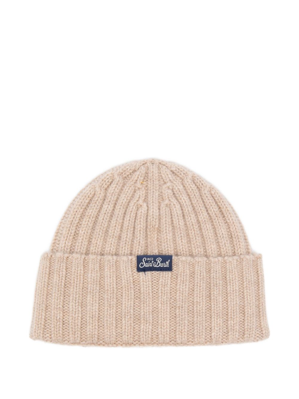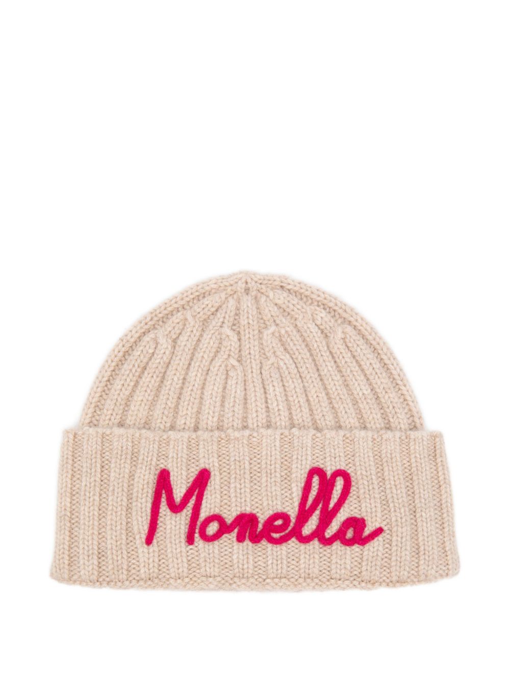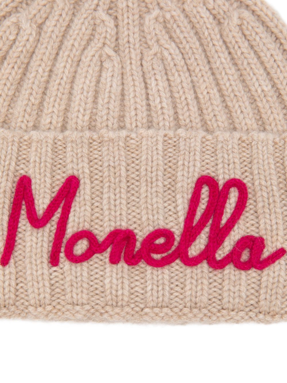 Cappello con dettaglio ricamato "MONELLA" , lavorazione in maglia, beige.