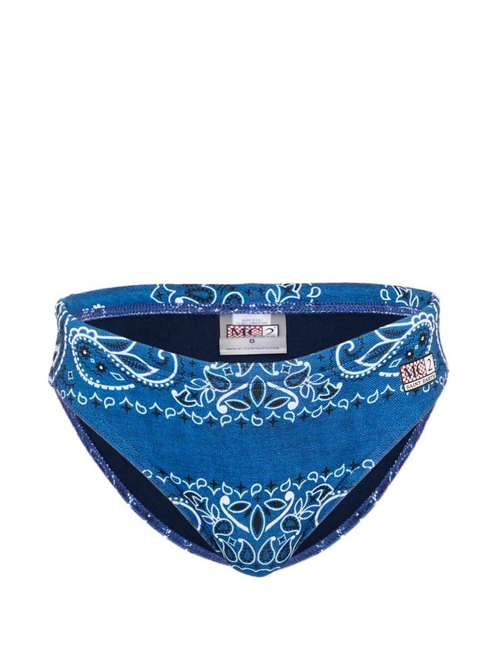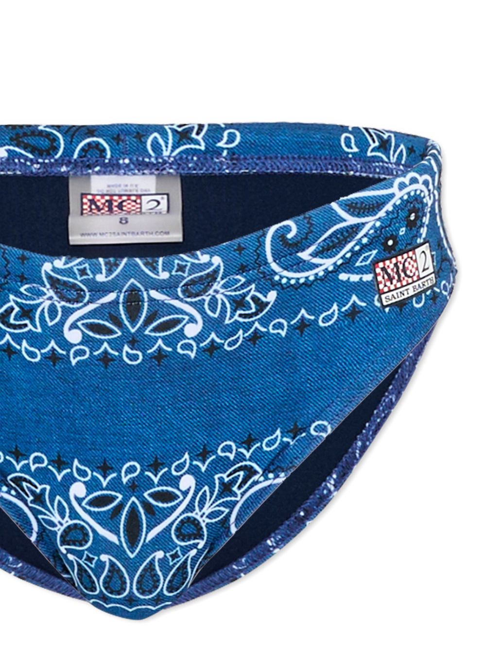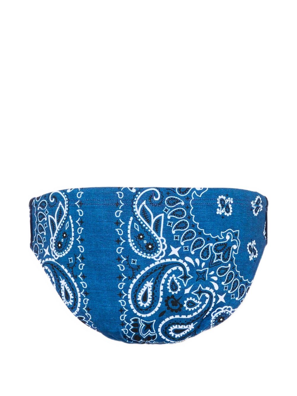 Costume con stampa bandana blu con stampa paisley, elastico in vita e patch con logo sul lato.