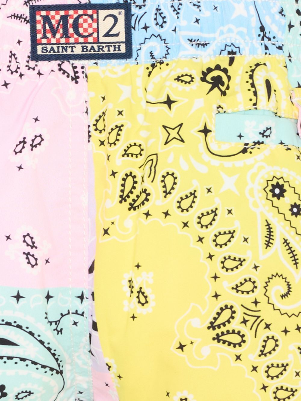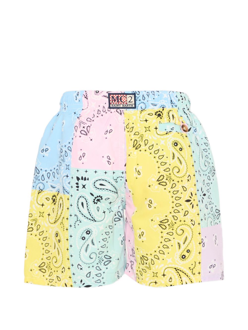 Costume blu e multicolor, stampa bandana, chiusura con coulisse, vita elasticizzata.