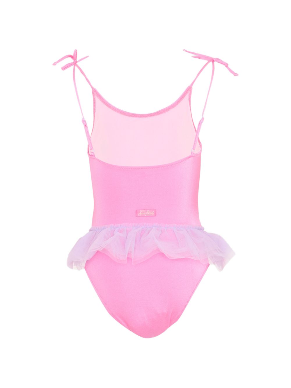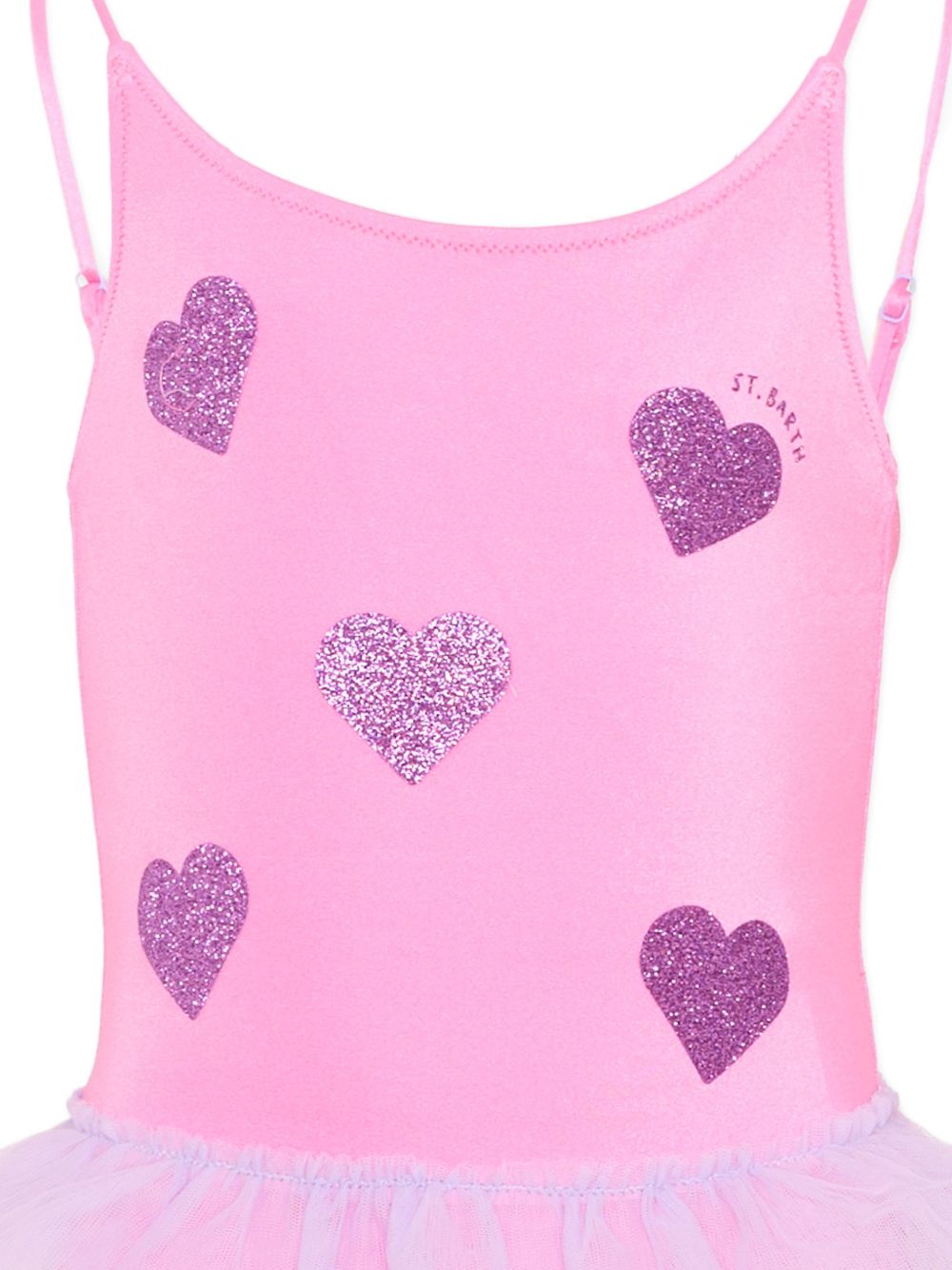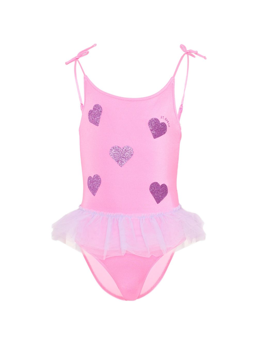 Costume intero, rosa, motivo a cuore, dettagli arricciati, spalline sottili, chiusura con lacci, finitura glitterata.