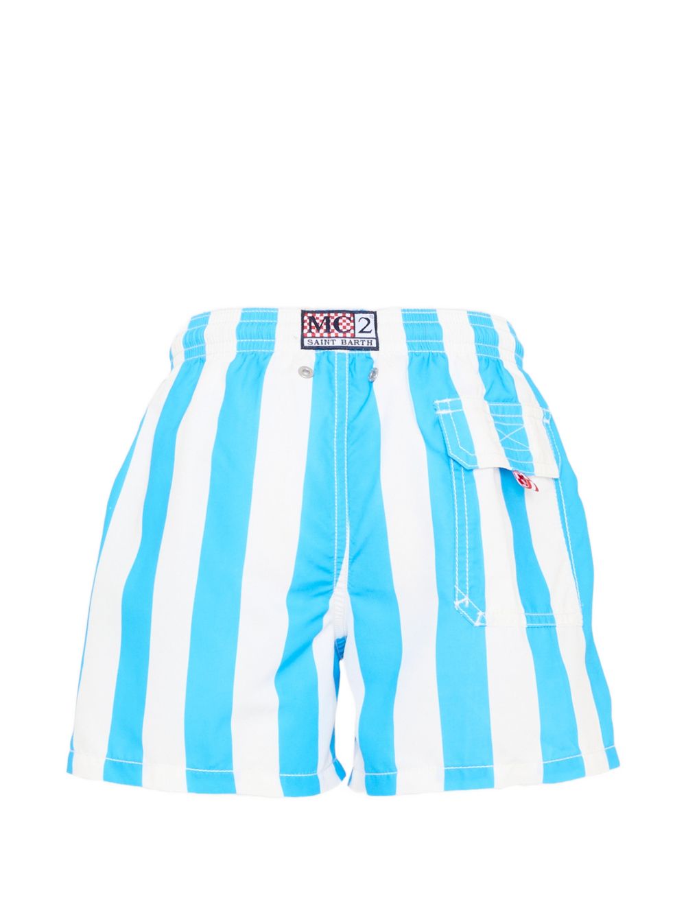 Costume azzurro chiaro, a righe, chiusura con coulisse, dettaglio numero sul retro.
