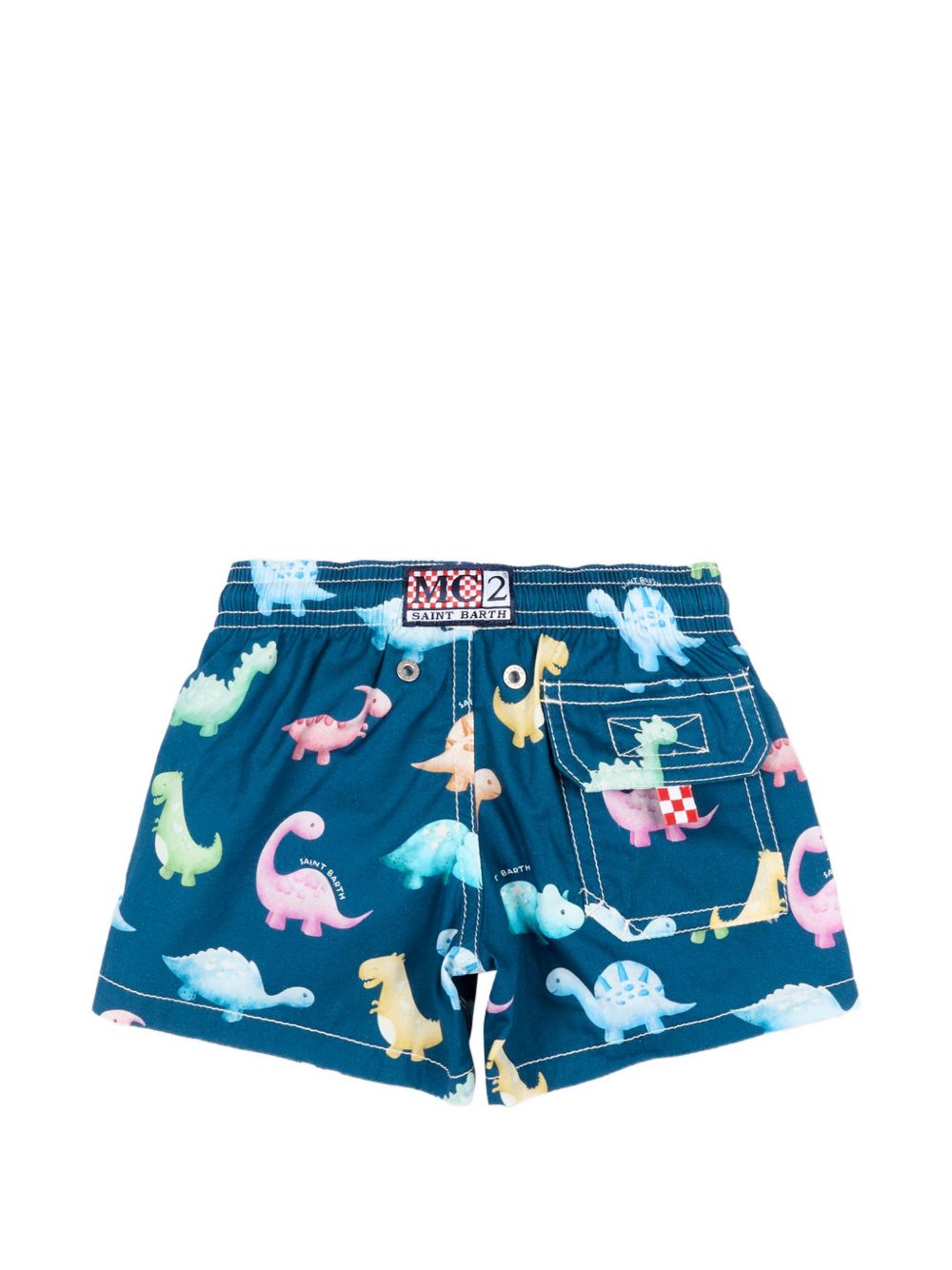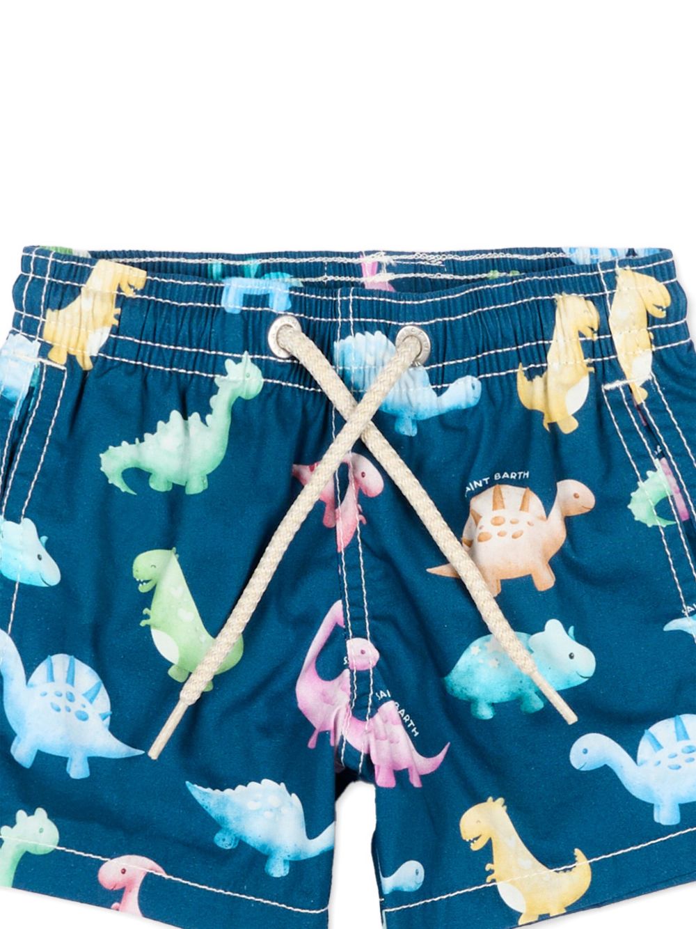 Costume blu, stampa con dinosauri, tasca laterale, chiusura con coulisse, vita elasticizzata, cotone.