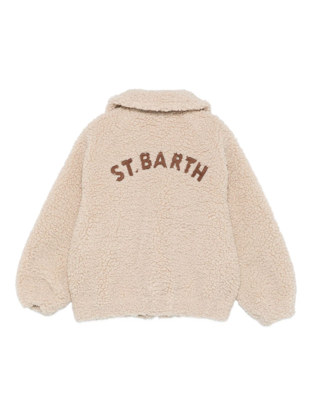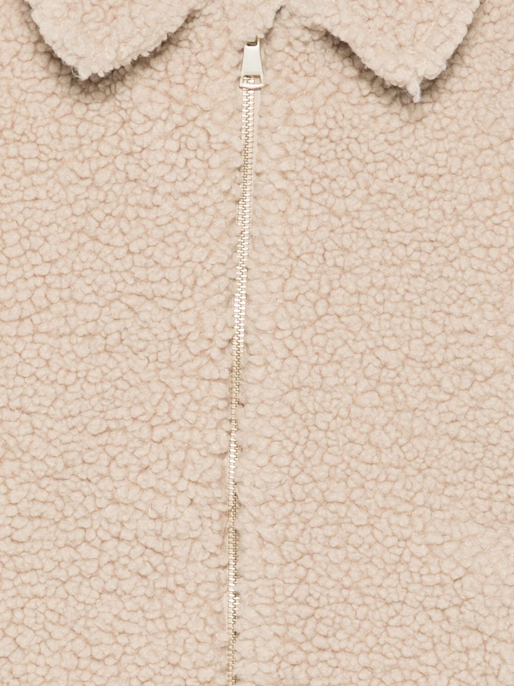 finitura testurizzata beige, collo a punta, chiusura con cerniera, maniche lunghe