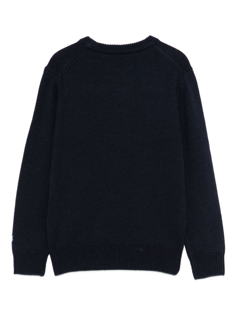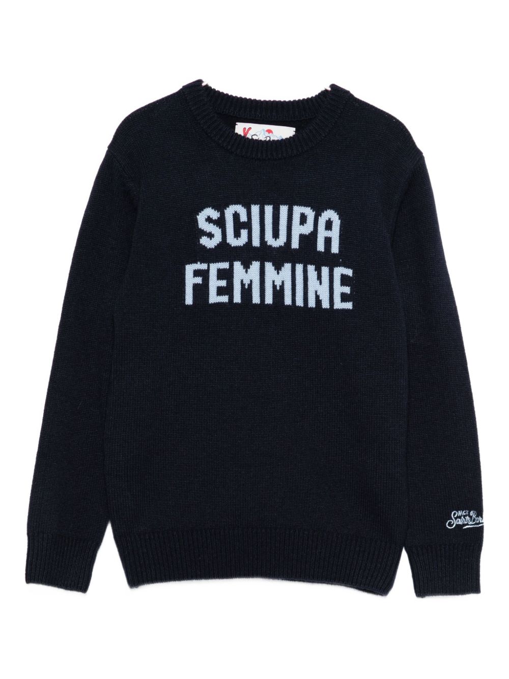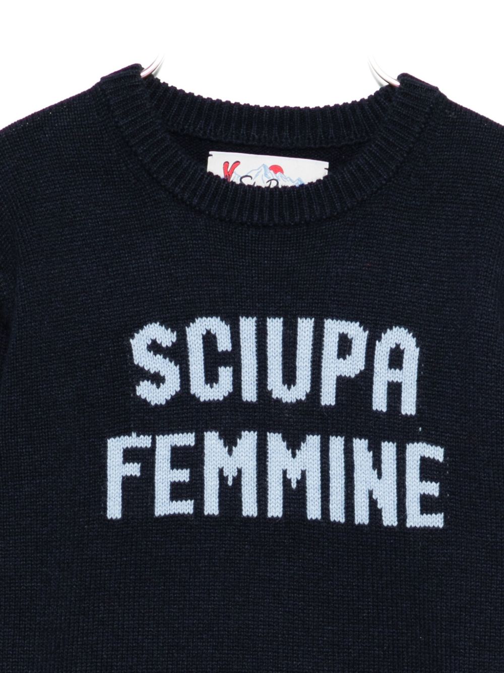 Maglione girocollo blu, maniche lunghe, orlo a coste, polsini a coste, scritta Sciupa Femmine celeste