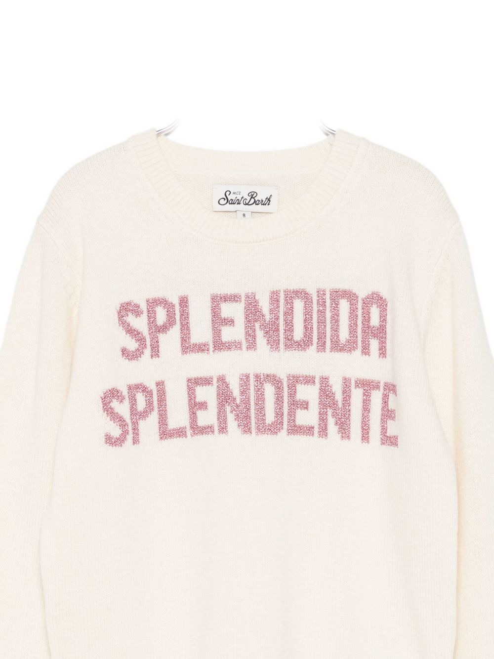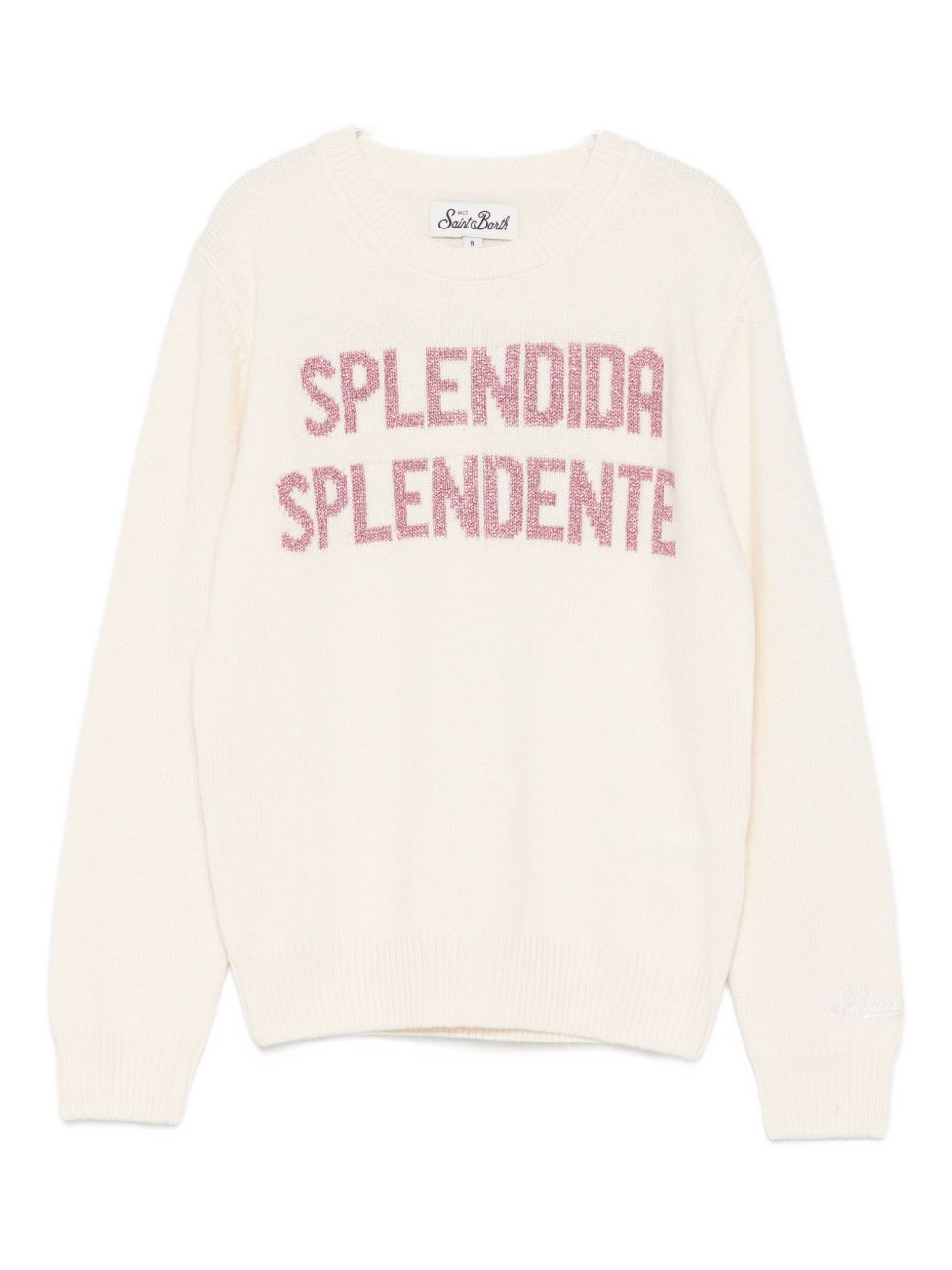 Maglione girocollo panna, maniche lunghe, decorazioni glitterate, scritta SPLENDIDA SPLENDENTE