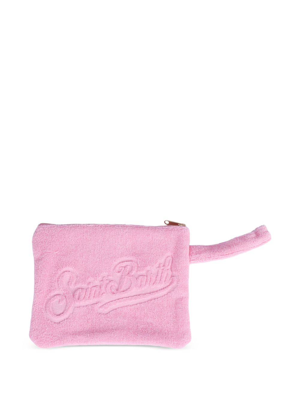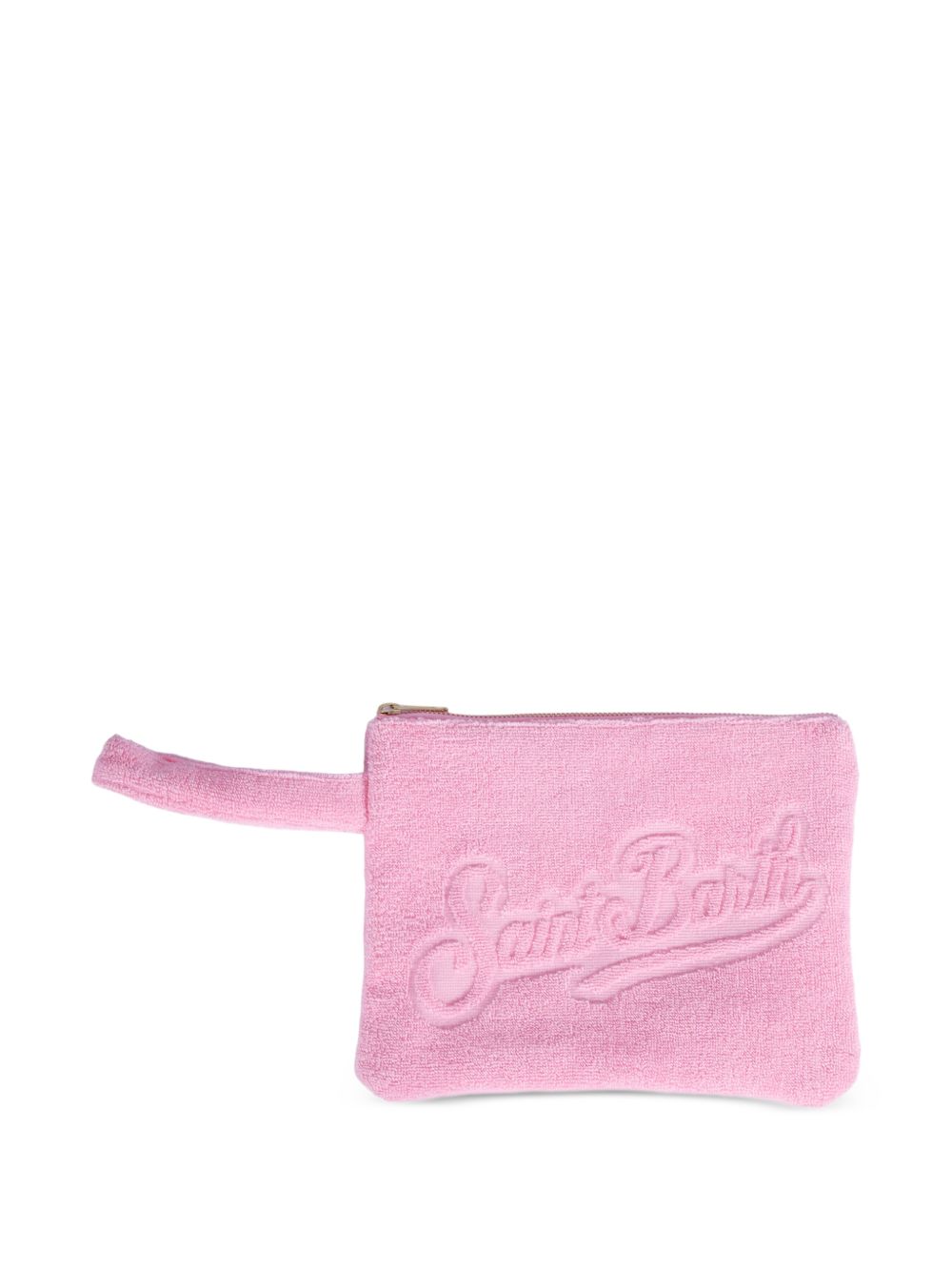 Pochette in tessuto in spugna, rosa, logo in rilievo, chiusura superiore con zip.
