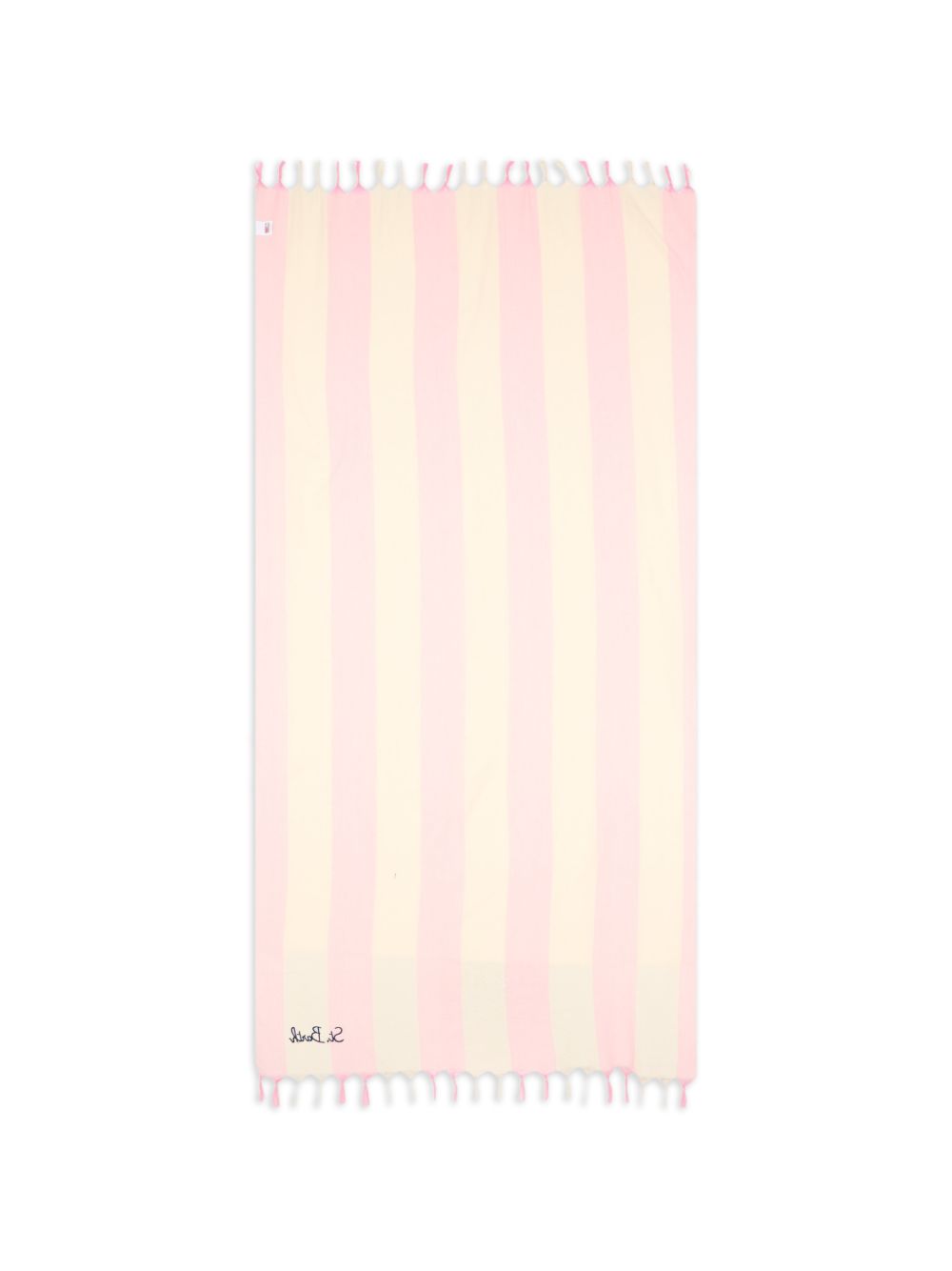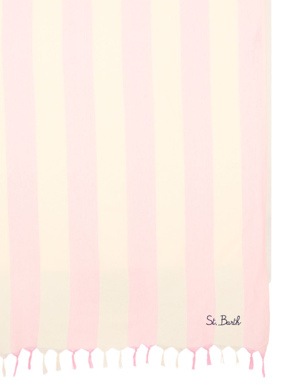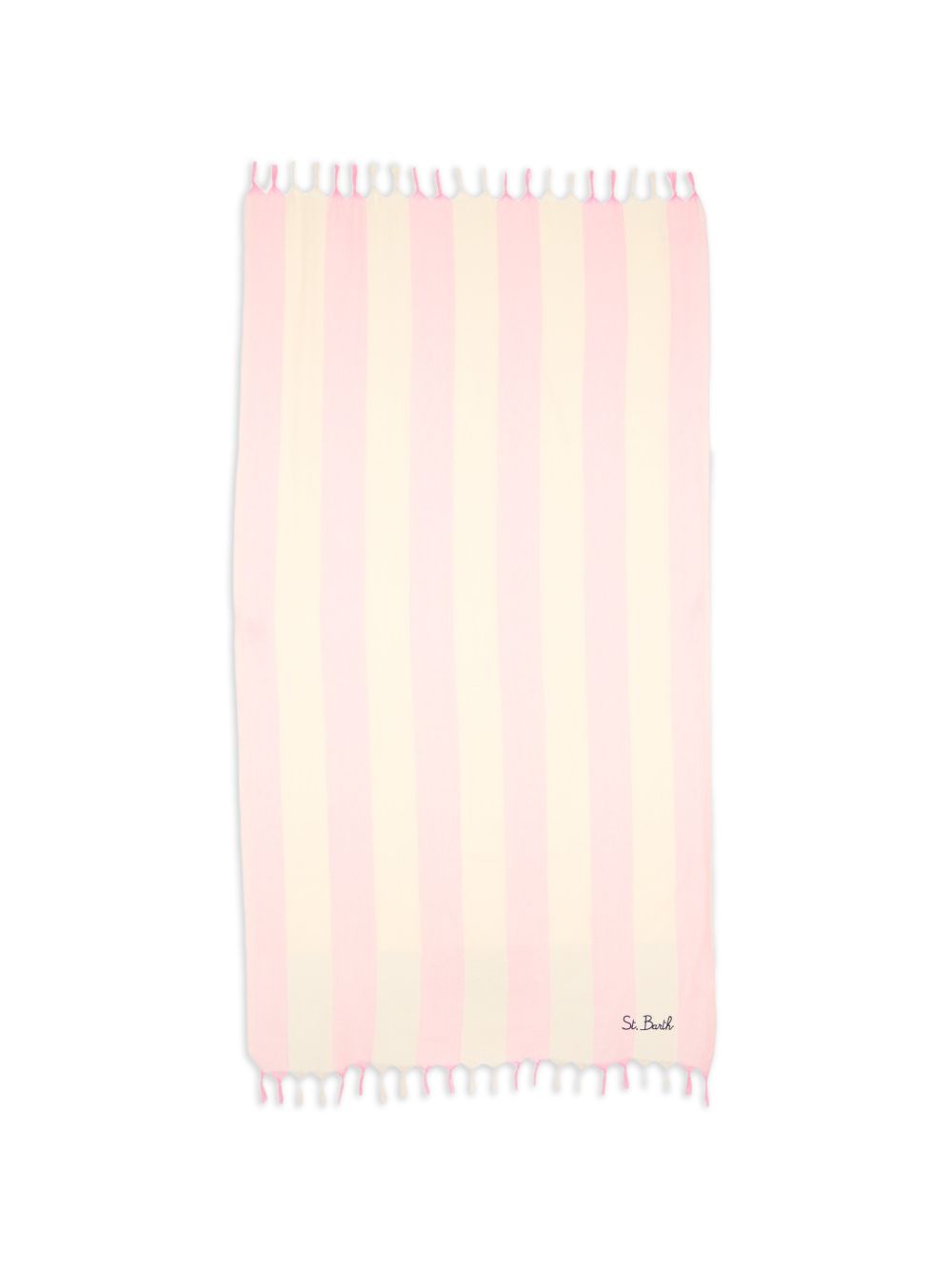 Telo motivo a righe, rosa, logo ricamato, bordo sfrangiato, forma rettangolare.