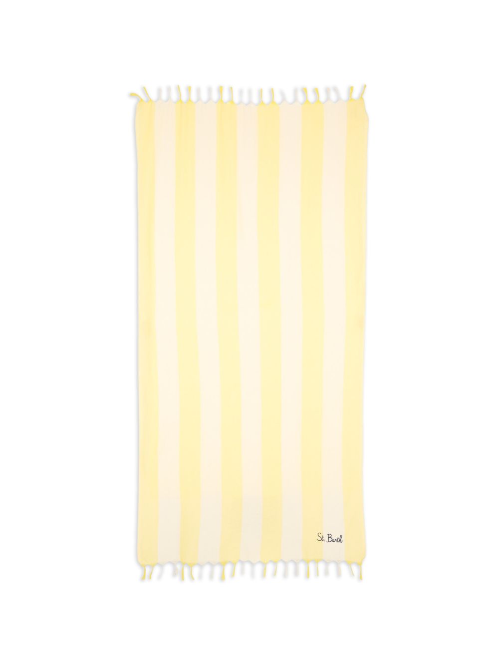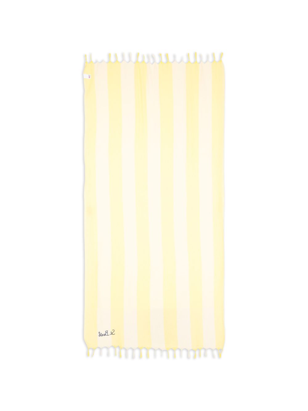 Telo motivo a righe, giallo, logo ricamato, bordo sfrangiato, forma rettangolare.