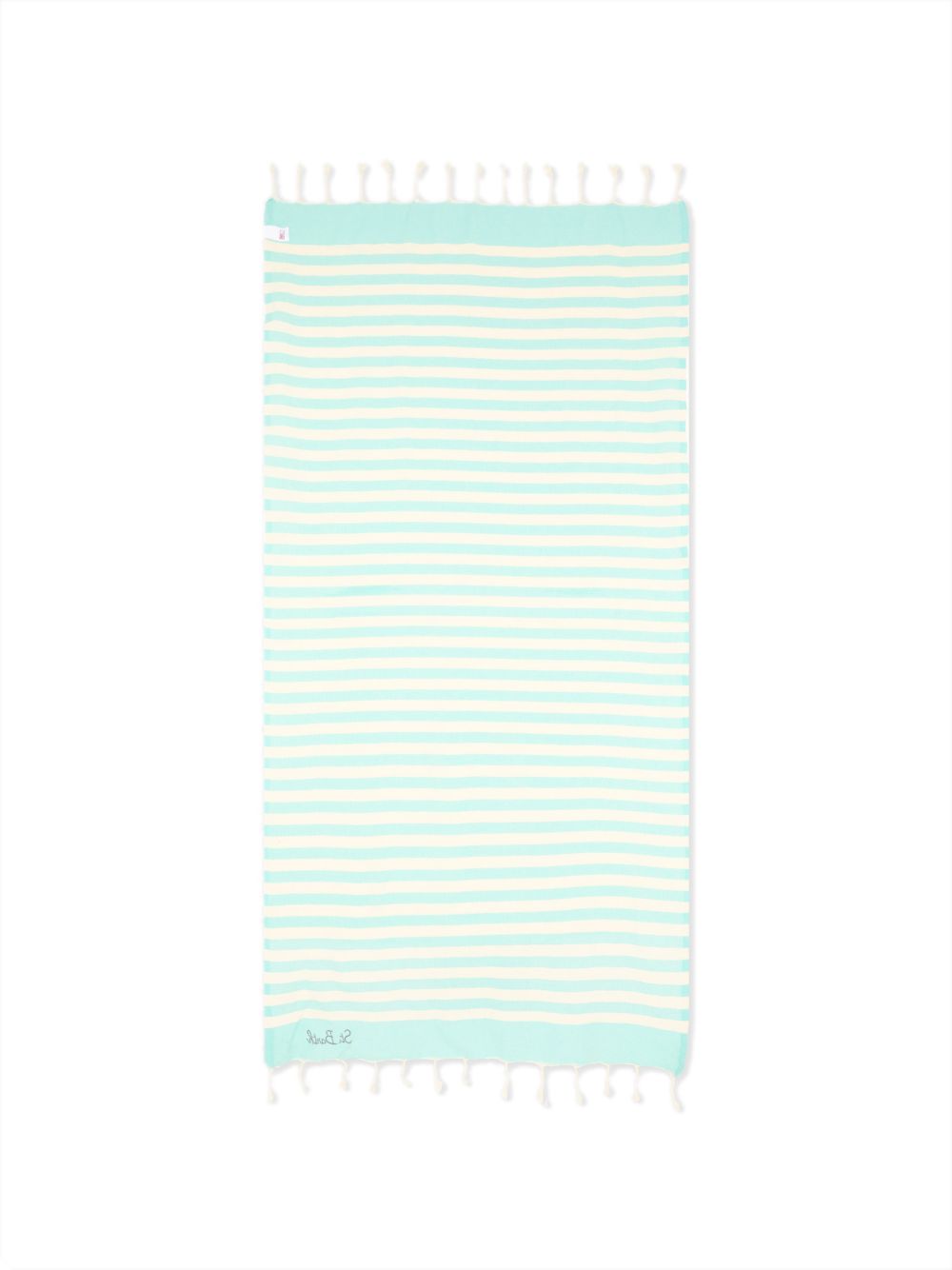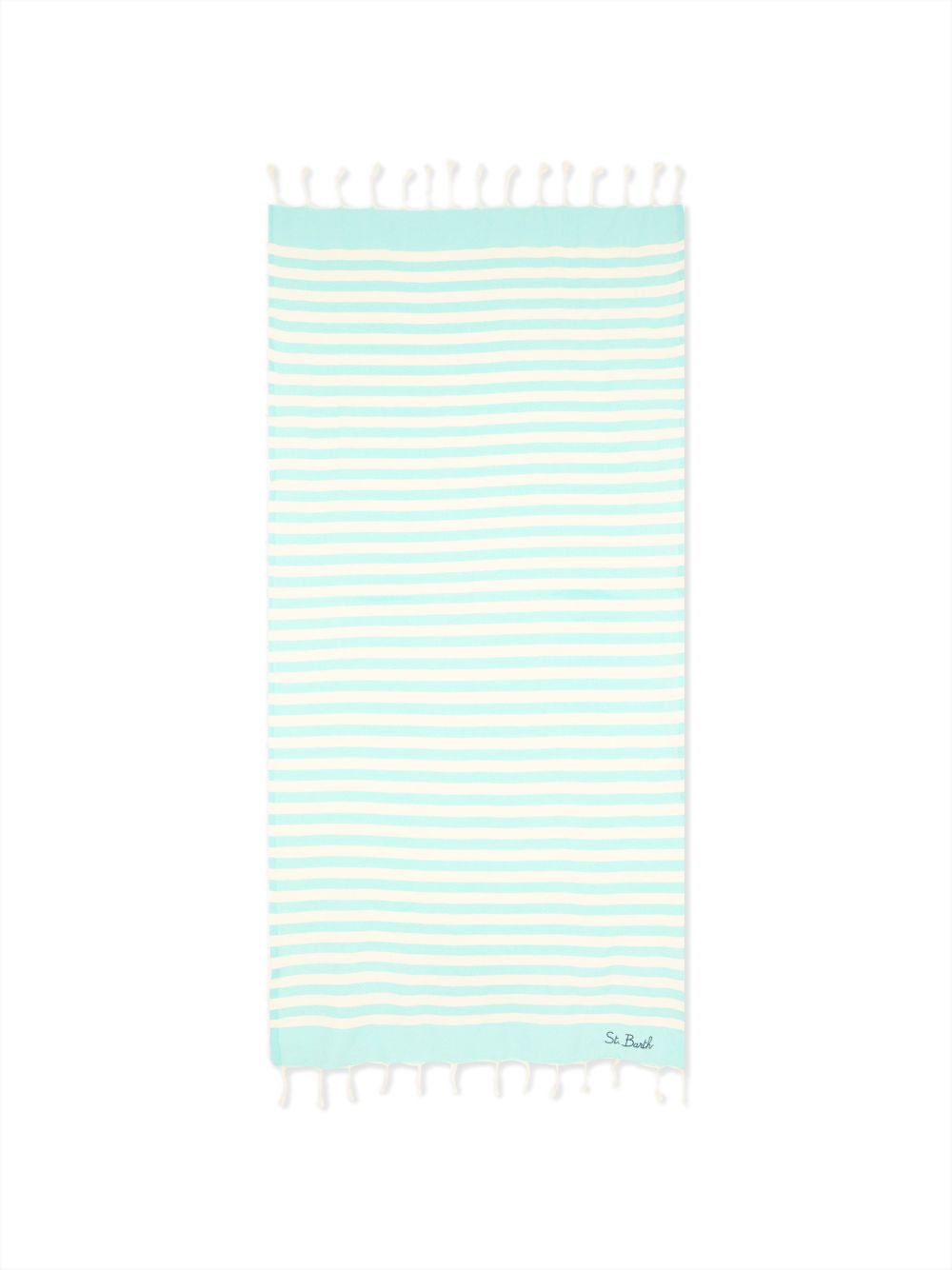 Telo motivo a righe, verde, logo ricamato, bordo sfrangiato, forma rettangolare.
