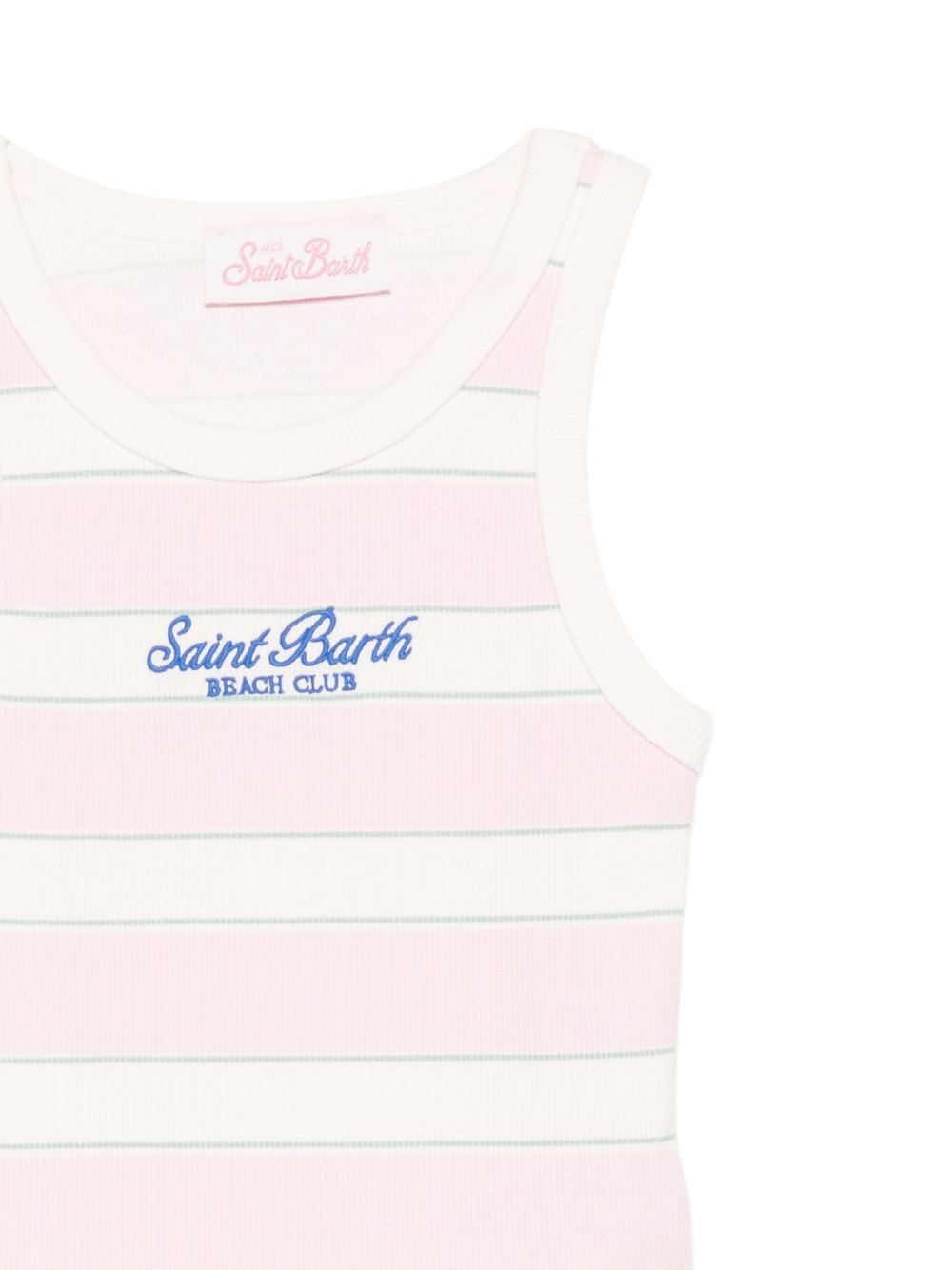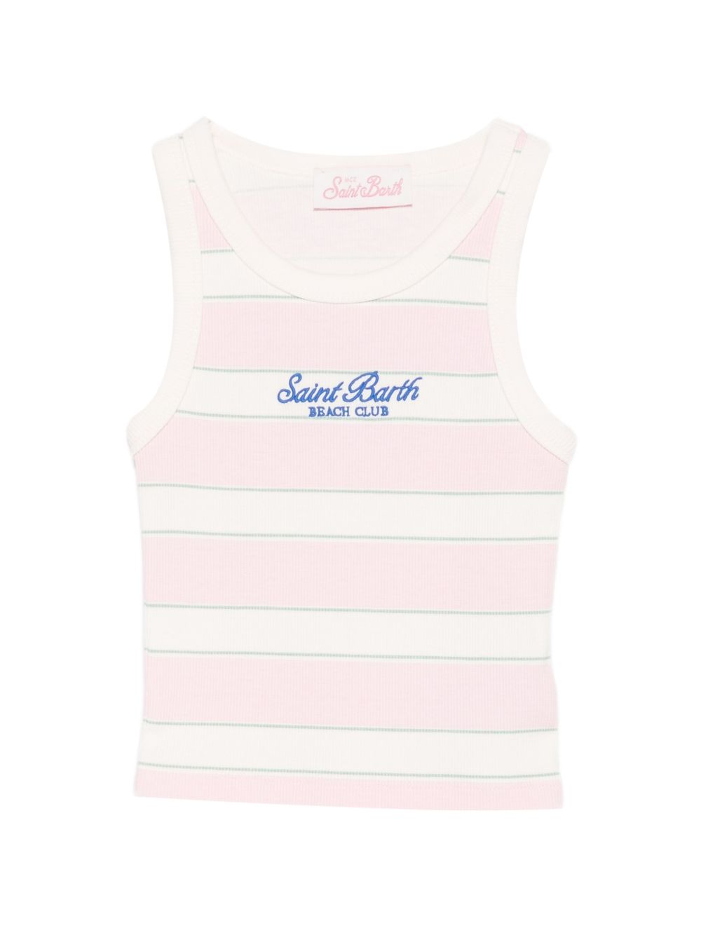 Top con tessuto a coste rosabianco, motivo a righe orizzontali, stampa logo sul petto, scollo rotondo, schiena a vogatore, senza maniche, orlo dritto.