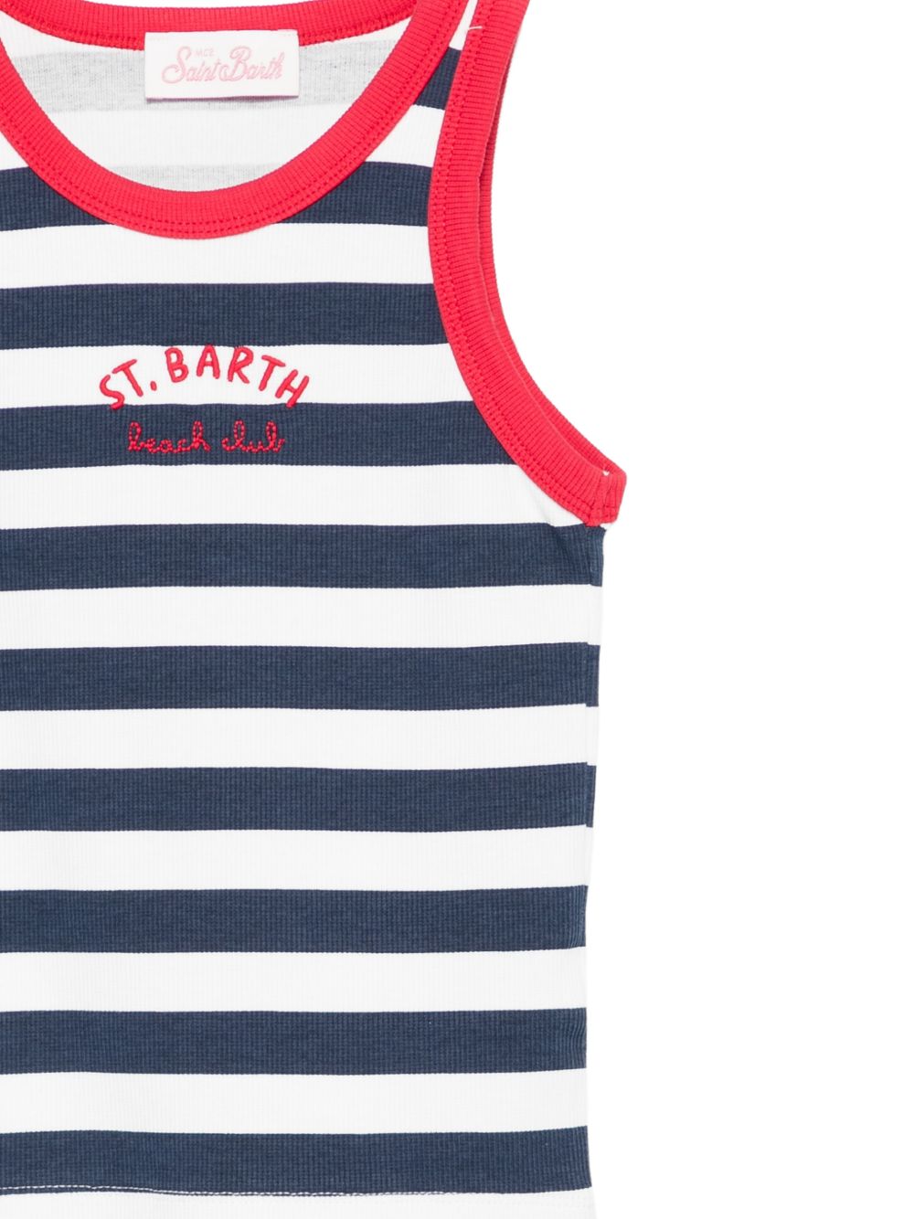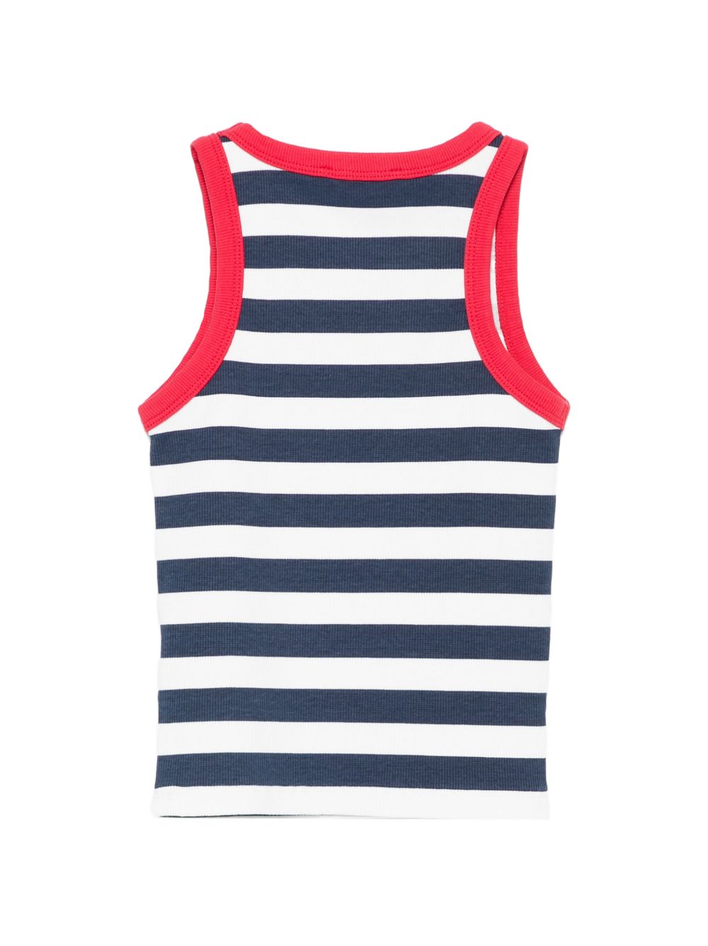 Top con fantasia a righe orizzontali blu e bianche, texture a coste, logo ricamato sul petto, scollo rotondo, senza maniche, orlo dritto.