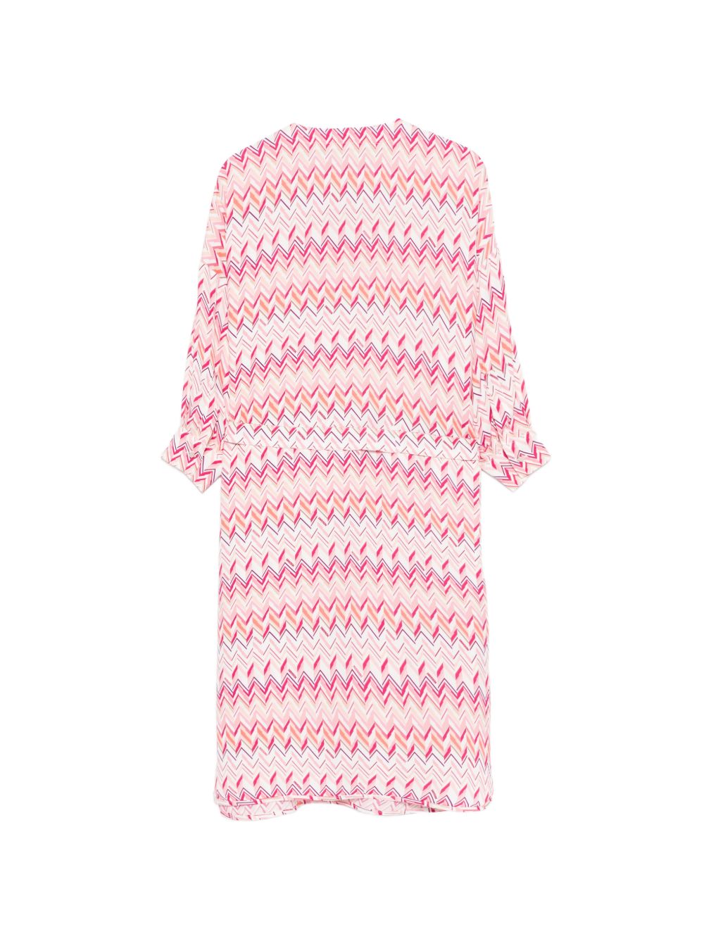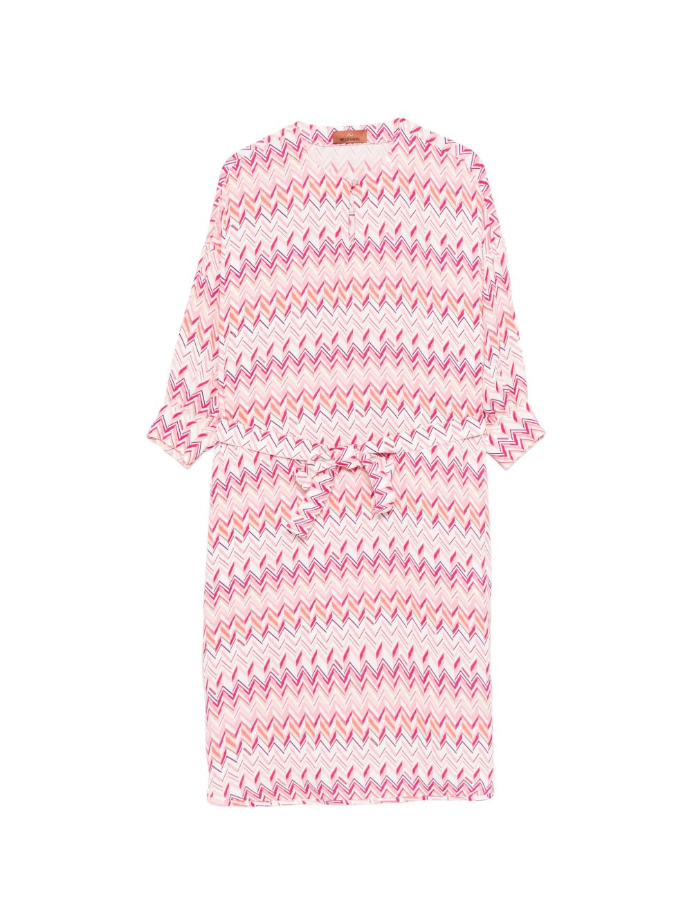 Abito rosa, motivo chevron, chiusura con nodo, scritta con logo.