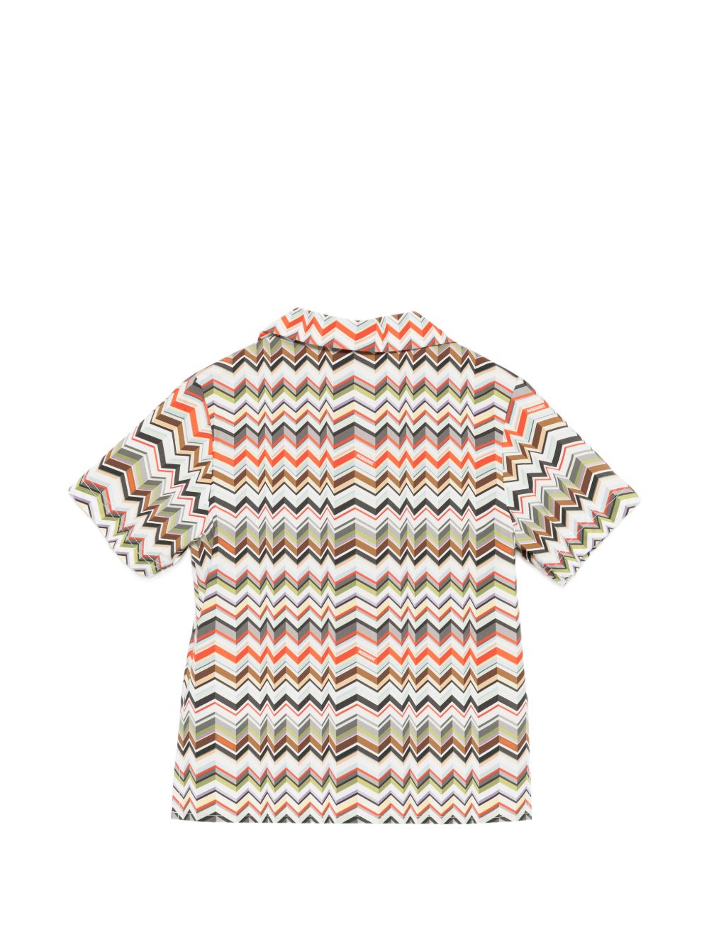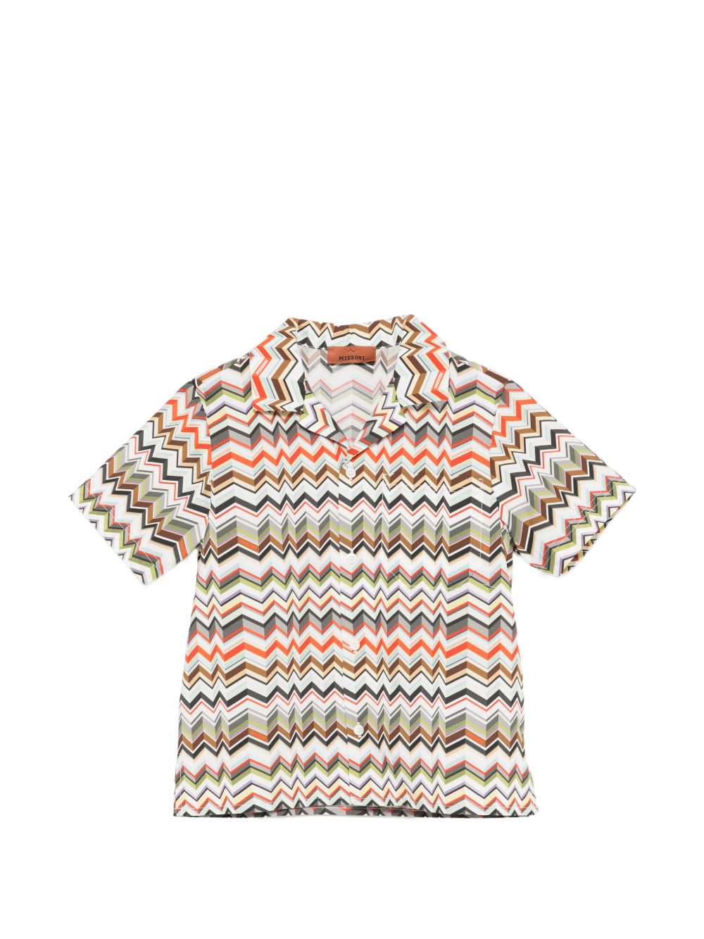 Camicia beige chiaromuticolor, motivo a zig zag, chiusura a bottoni, colletto alla cubana, maniche corte.