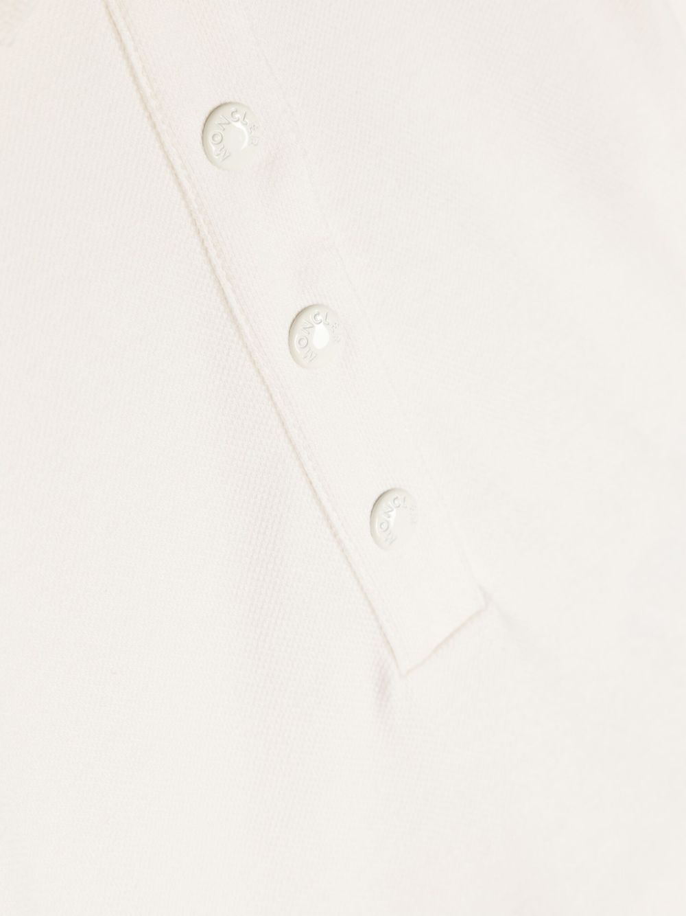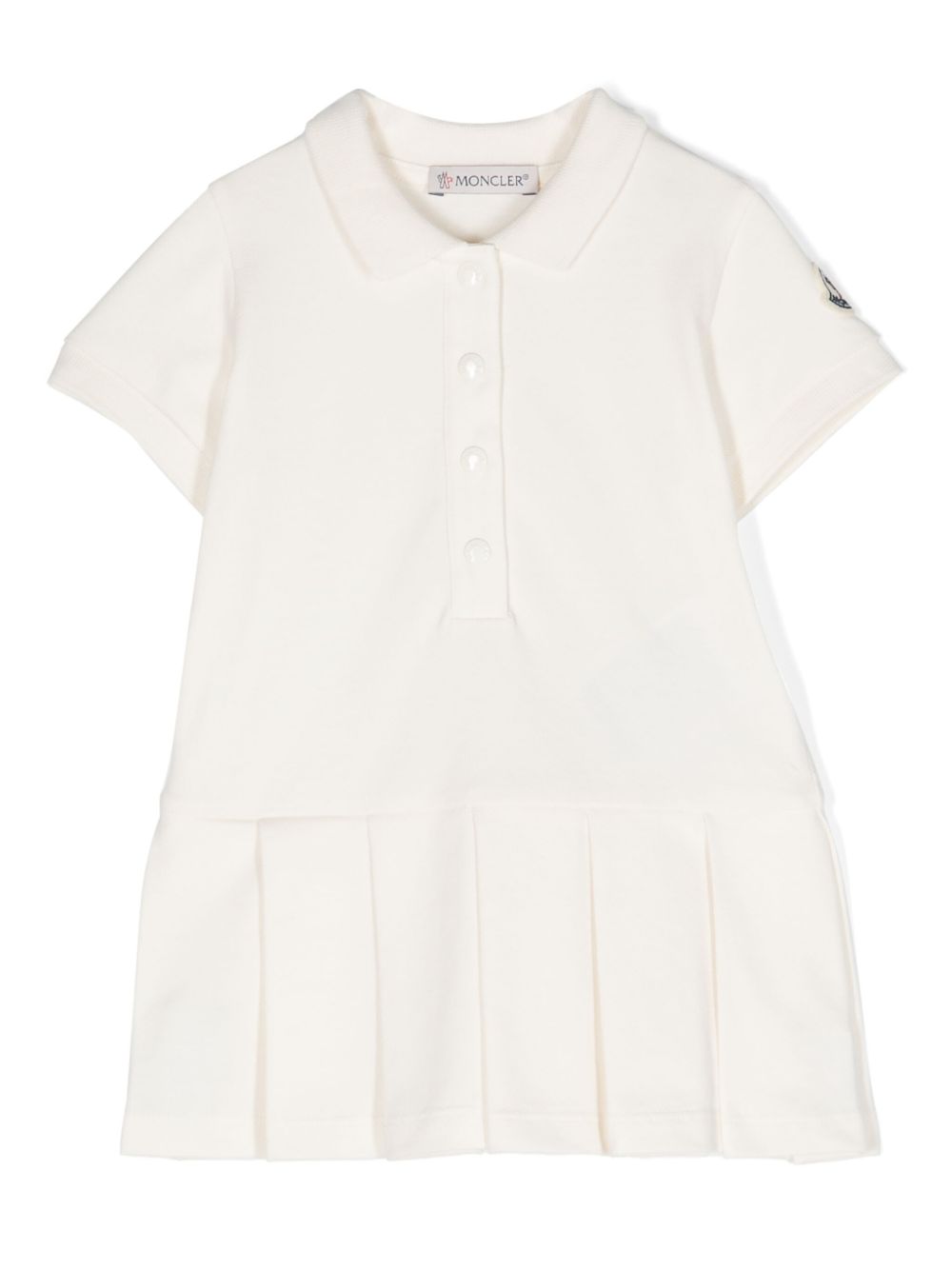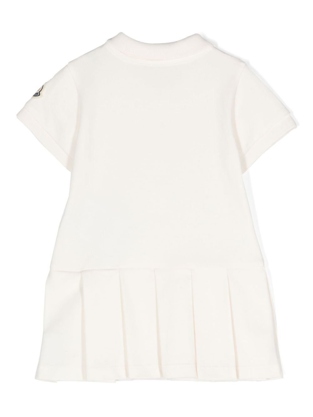 tessuto piqué in misto cotone bianco, colletto polo, maniche corte, toppa con logo sulla manica, gonna plissettata, chiusura con bottoni a pressione sul colletto