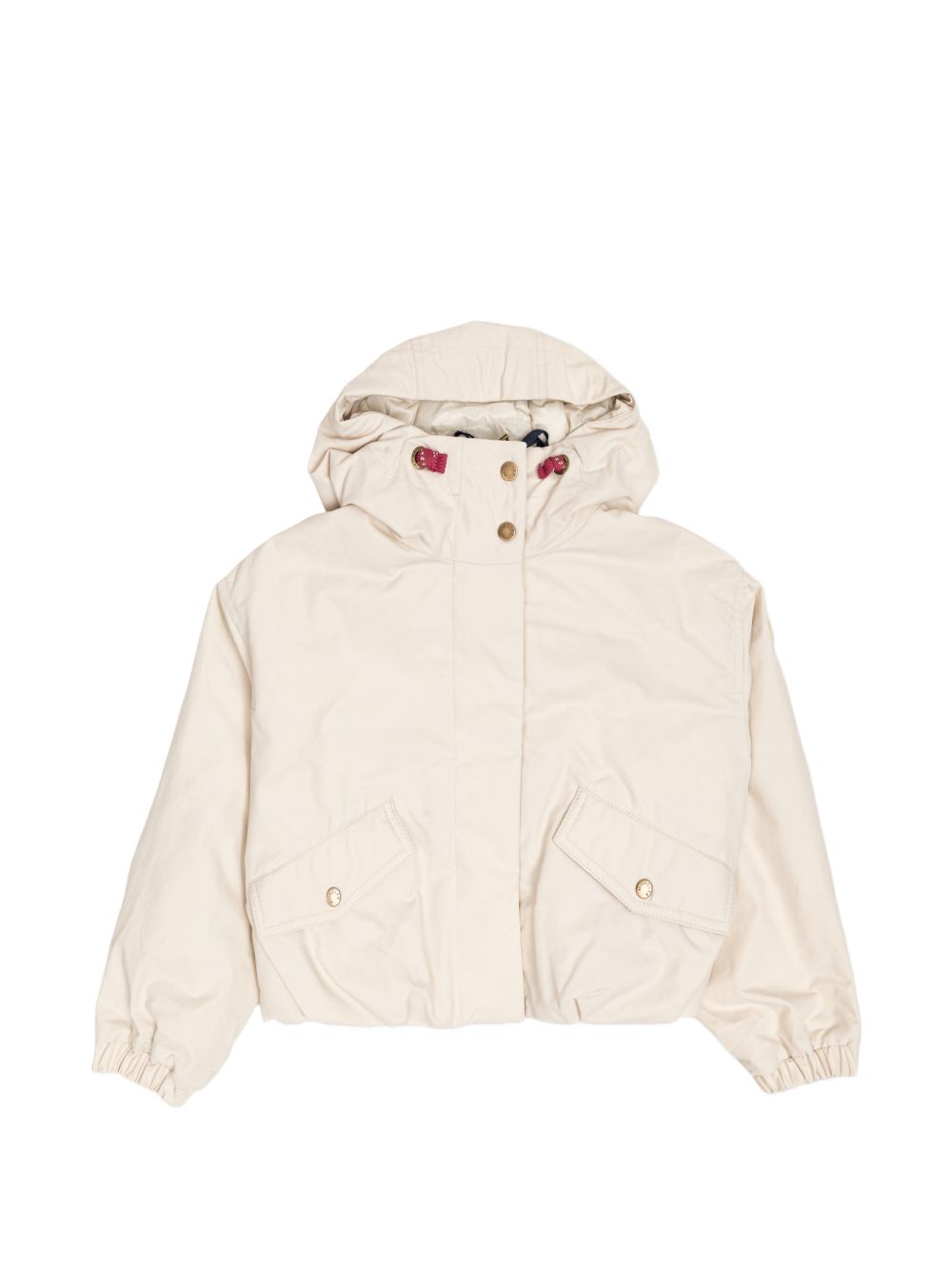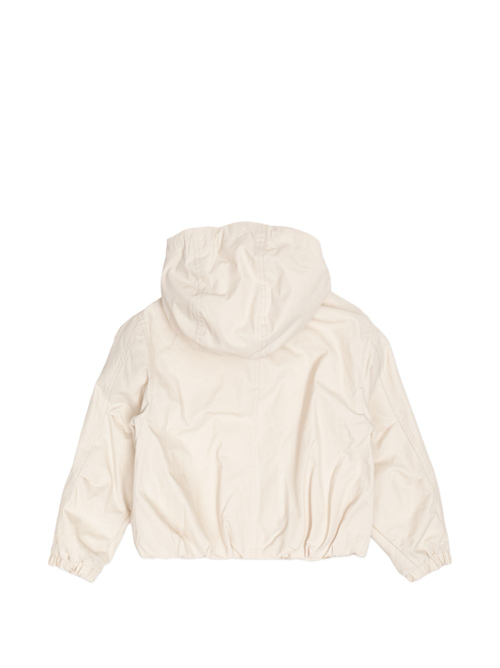 cappuccio bianco chiusura frontale con bottoni tasche anteriori con patta maniche lunghe orlo elasticizzato