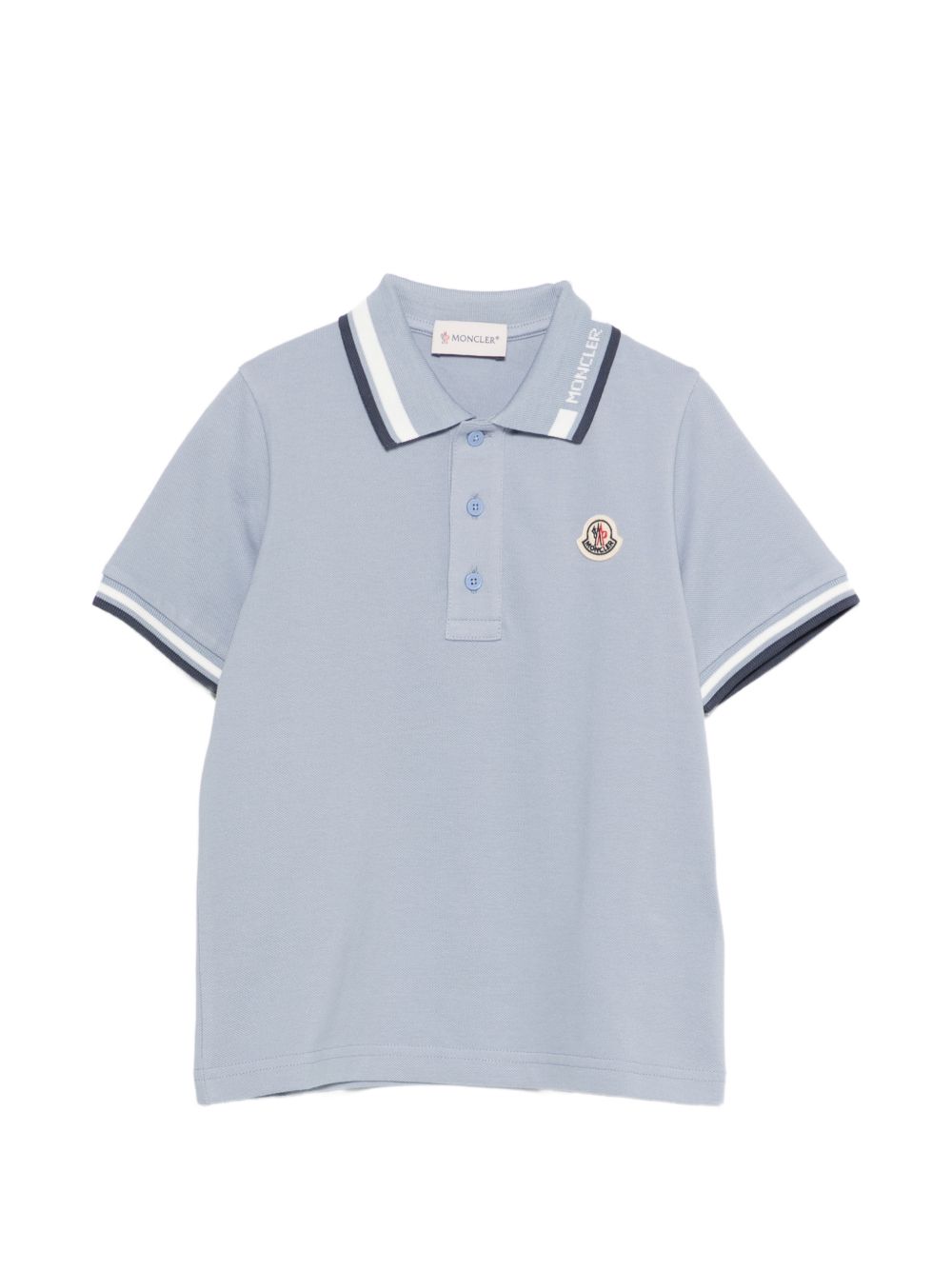 Dettagli a righe blu, abbottonatura a tre bottoni, patch con logo, maniche corte, colletto a punta.