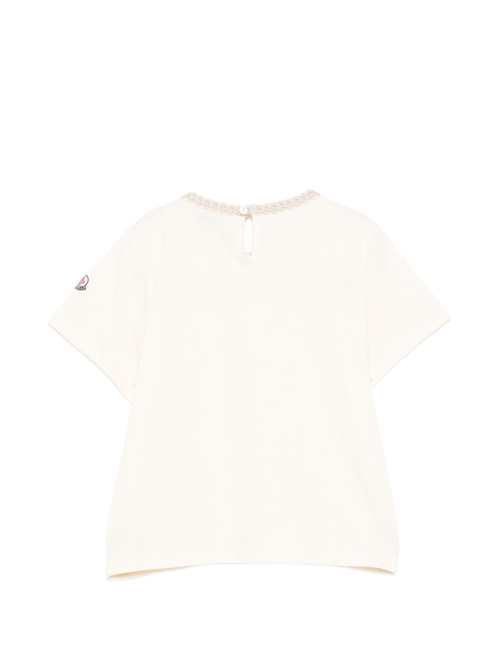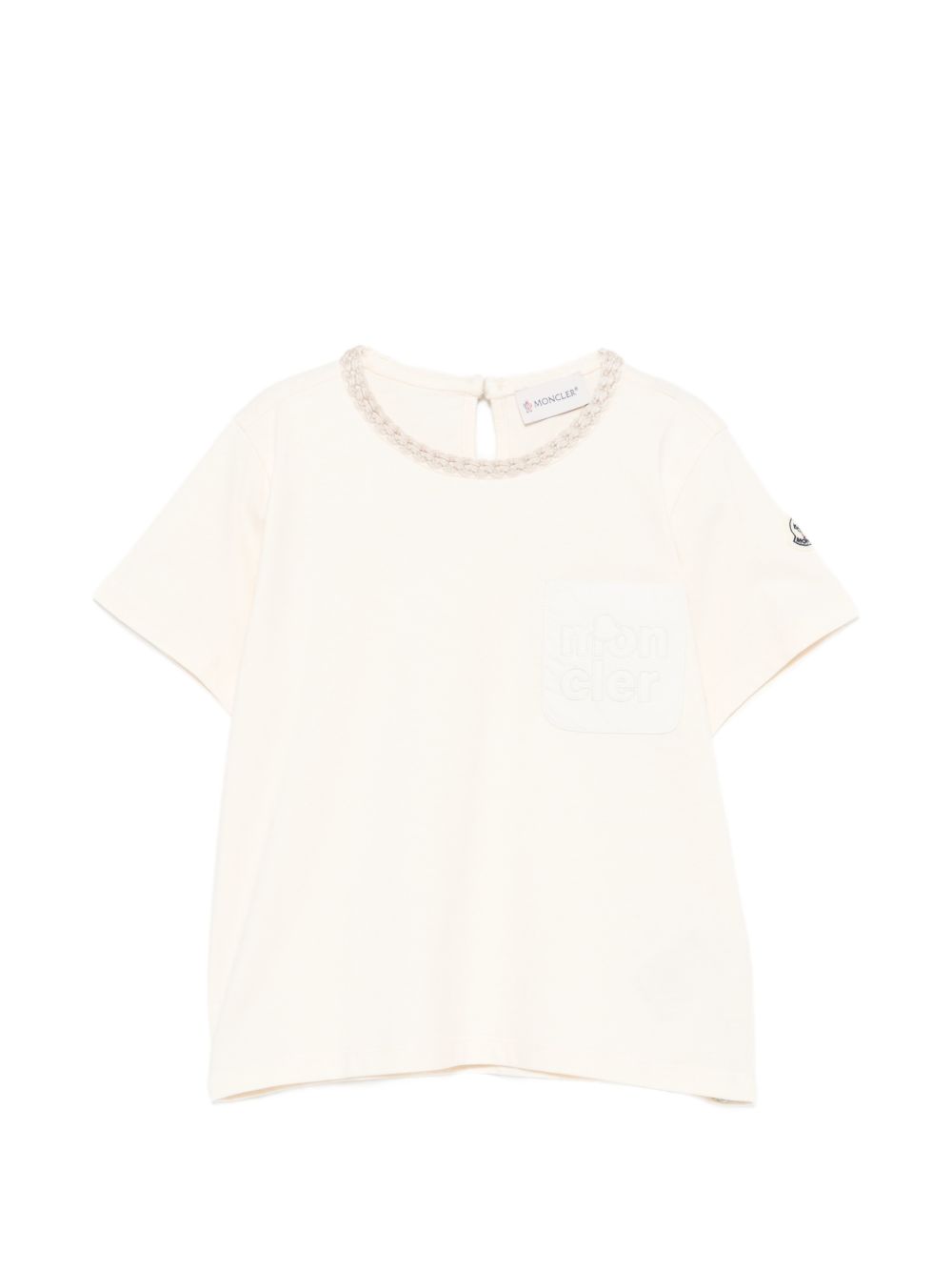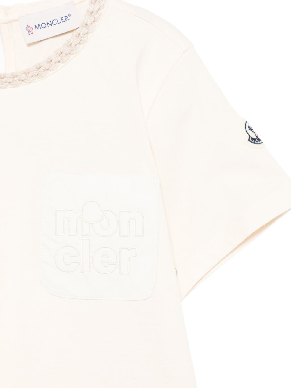 rifiniture beige chiaro, logo applicato, tasca sul petto, maniche corte, chiusura posteriore con bottoni