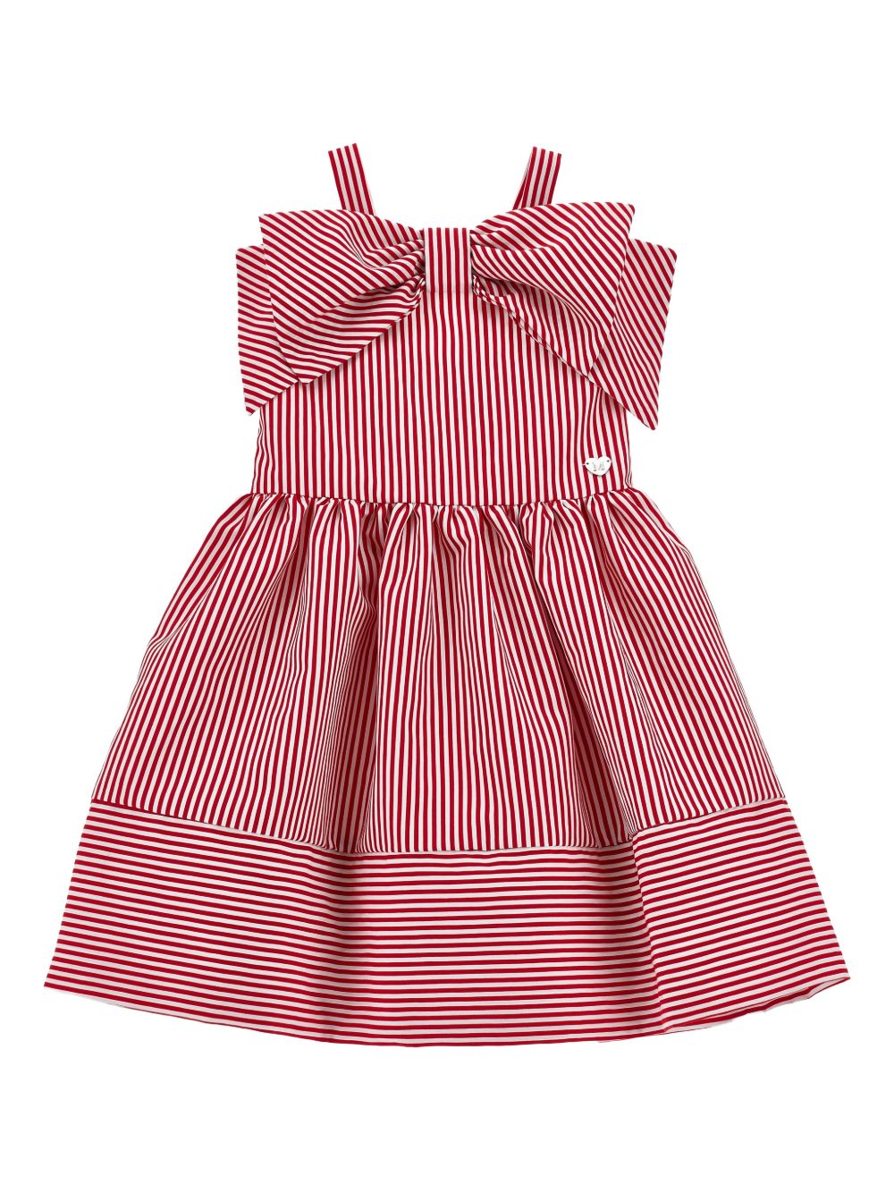 motivo a righe rosse e bianche, dettaglio fiocco, spalline, gonna a balze, dettaglio logo color argento
