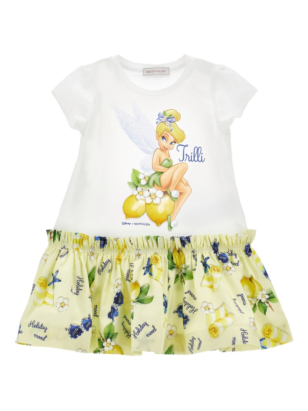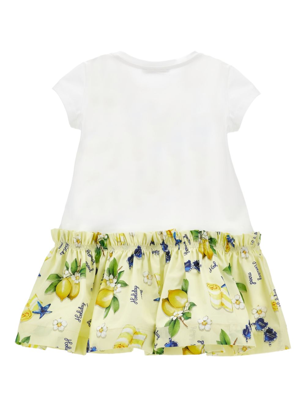 Abito con stampa grafica bianca e gialla orlo arricciato stampa floreale maniche corte scollo rotondo