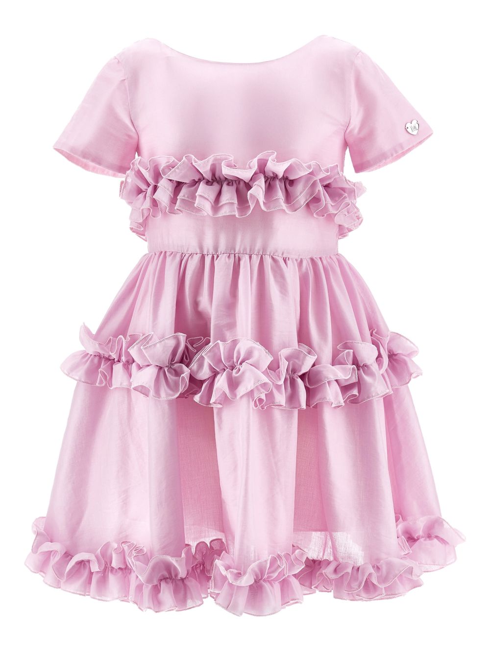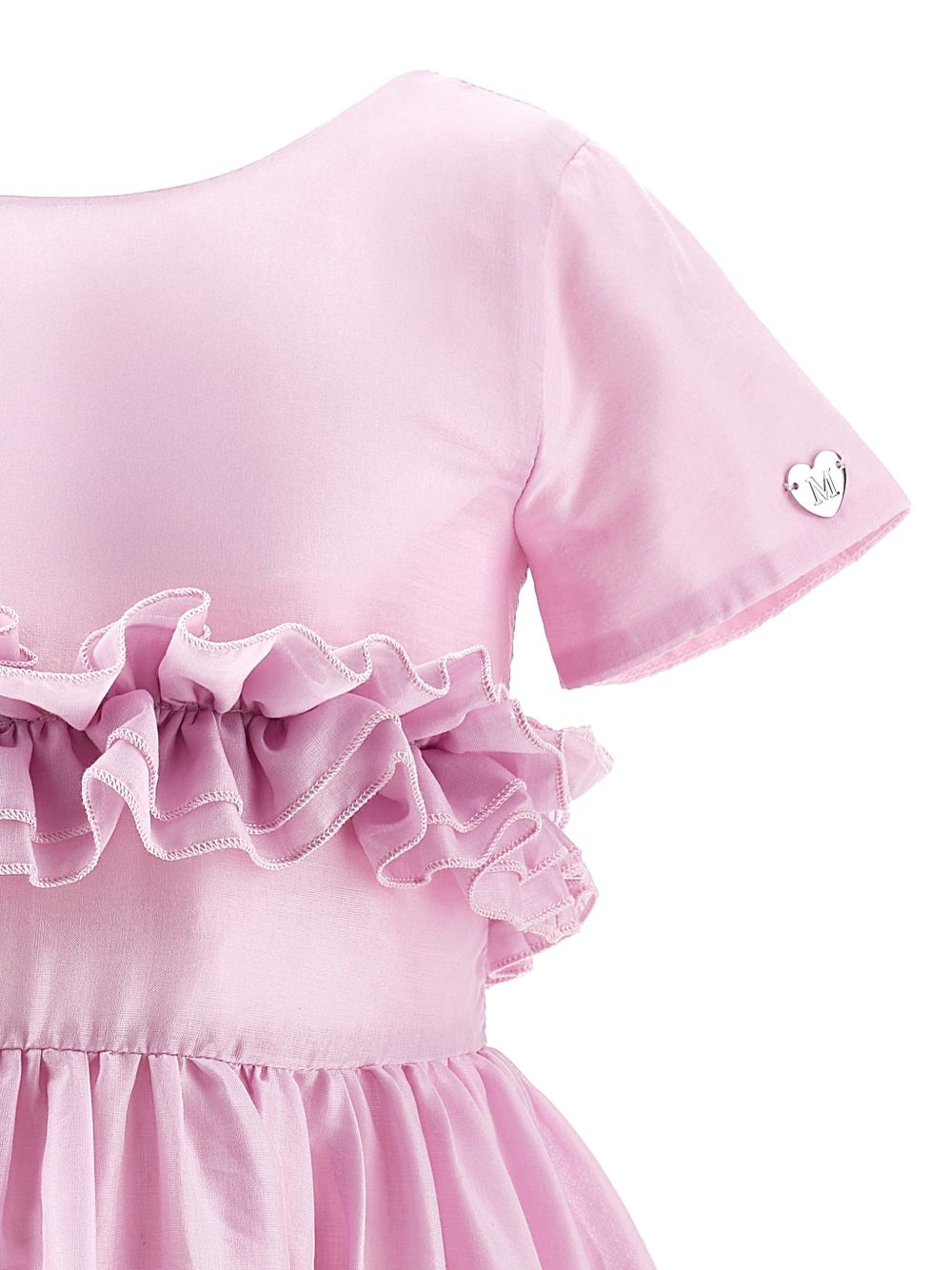 Abito a maniche corte rosa, volant a balze, dettaglio a cuore, scollo rotondo, chiusura con zip