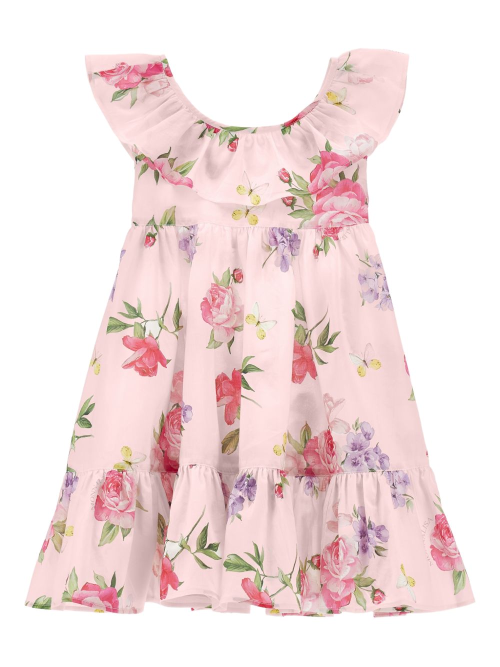 Abito con balze senza maniche con stampa floreale rosa chiaro e volant