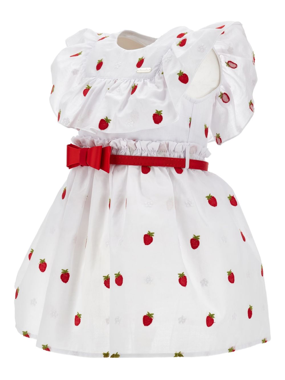 Abito bianco con stampa di fragole, dettagli arricciati, dettaglio fiocco, dettaglio cintura, maniche corte