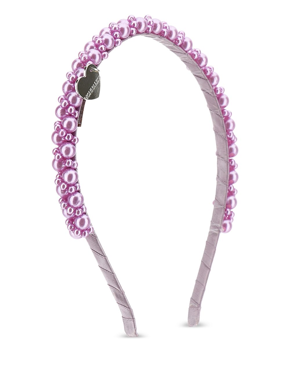 Cerchietto con decorazioni con perline lilla, ciondolo a forma di cuore, dettaglio logo
