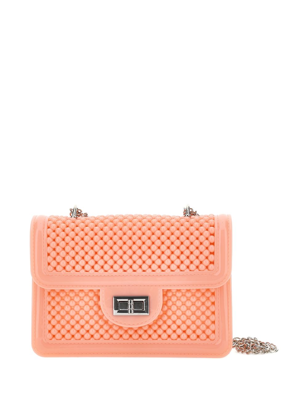 Borsa arancione con tracolla a catena con design di perline, chiusura a scatto, patta superiore