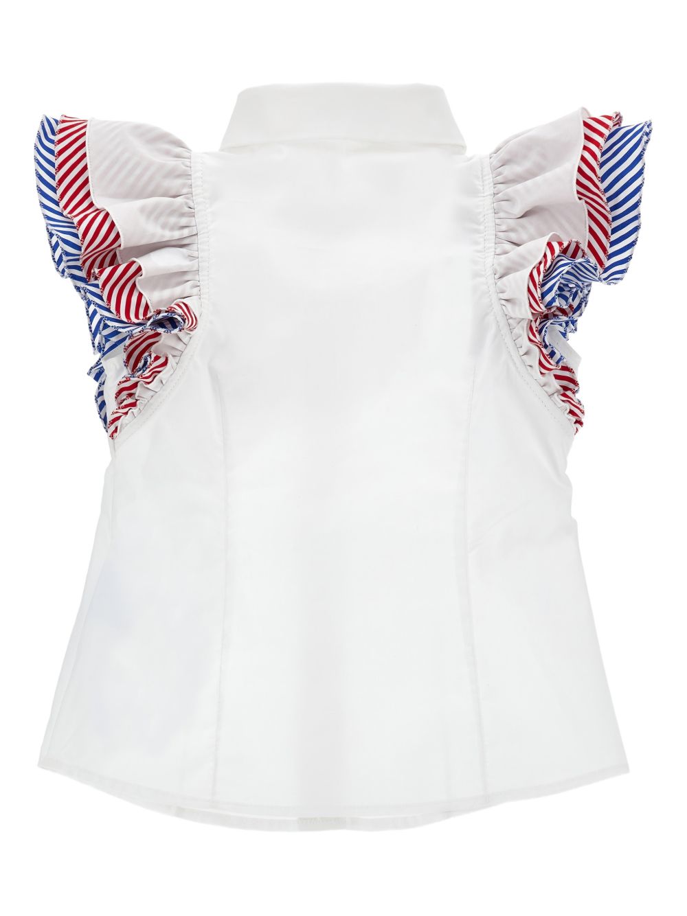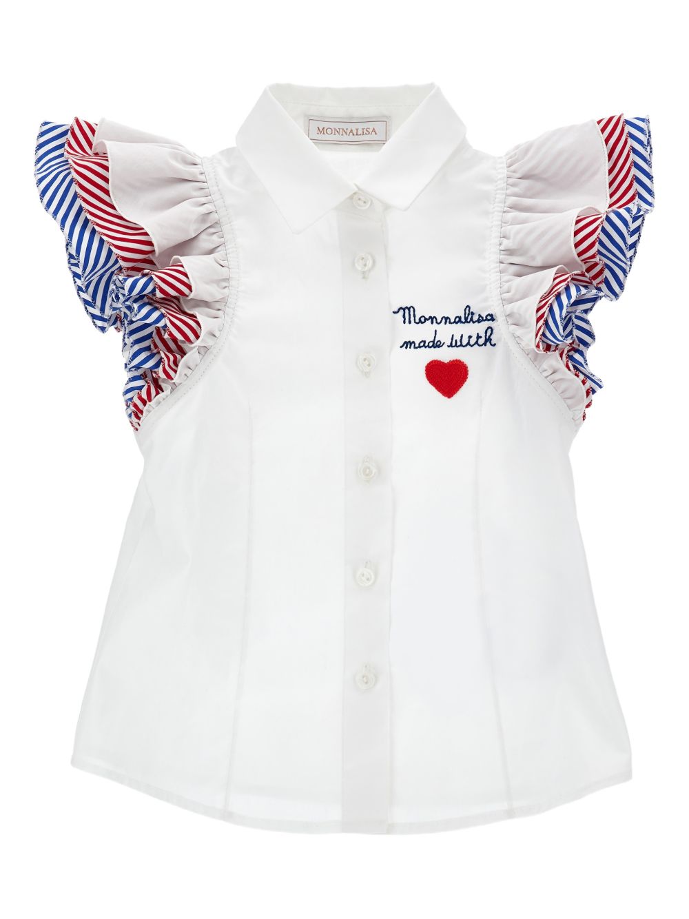 maniche a balze a righe bianche chiusura con bottoni colletto con punta a cuore ricamata