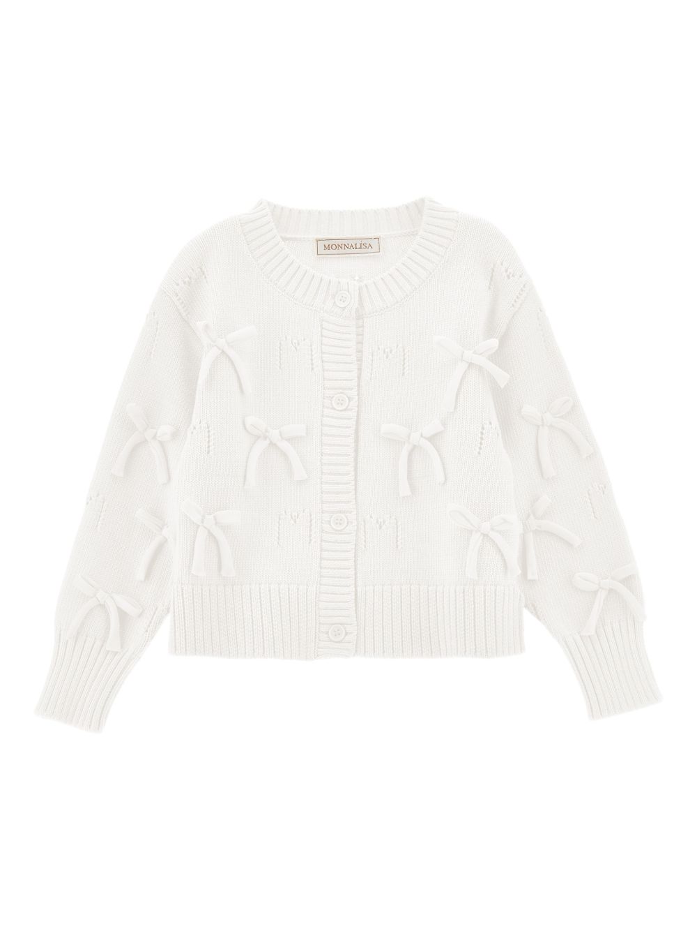 Camicia bianca con dettaglio fiocco, maglia a coste scollo rotondo chiusura frontale con bottoni maniche lunghe