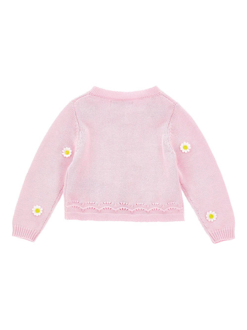 Cardigan rosa con decorazioni, girocollo, amniche lunghe, chiusura con bottoni