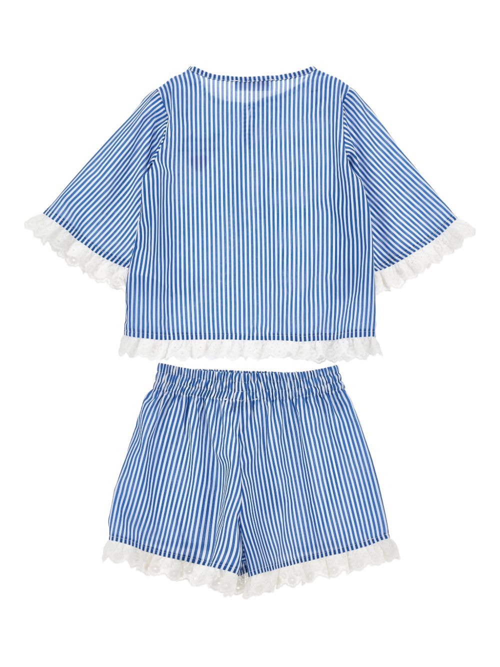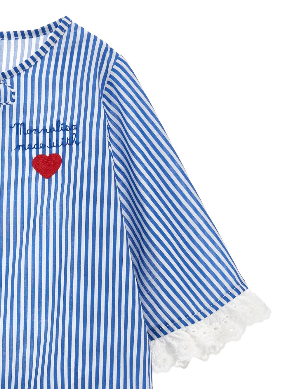 motivo a cuore con rifiniture in pizzo a righe blu, dettaglio con laccetto e elastico in vita