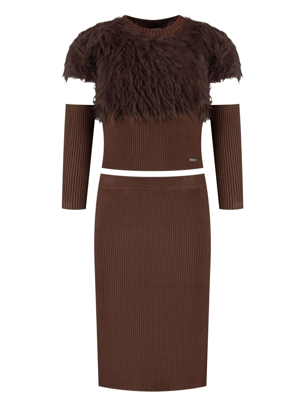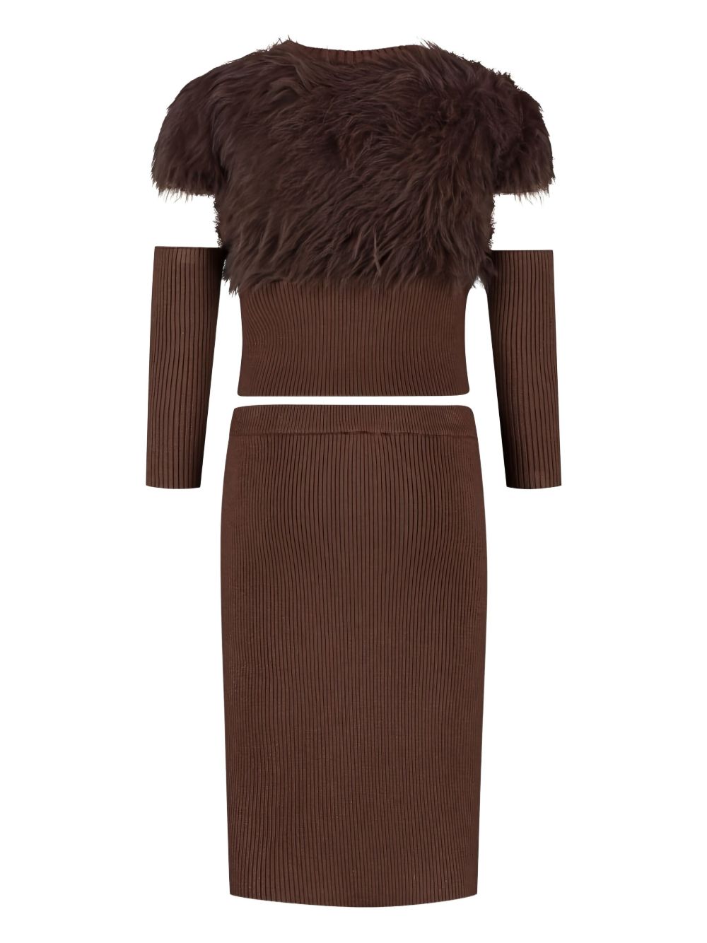 Set a coste con top in pelliccia sintetica, marrone, gonna a coste, maniche lunghe, girocollo