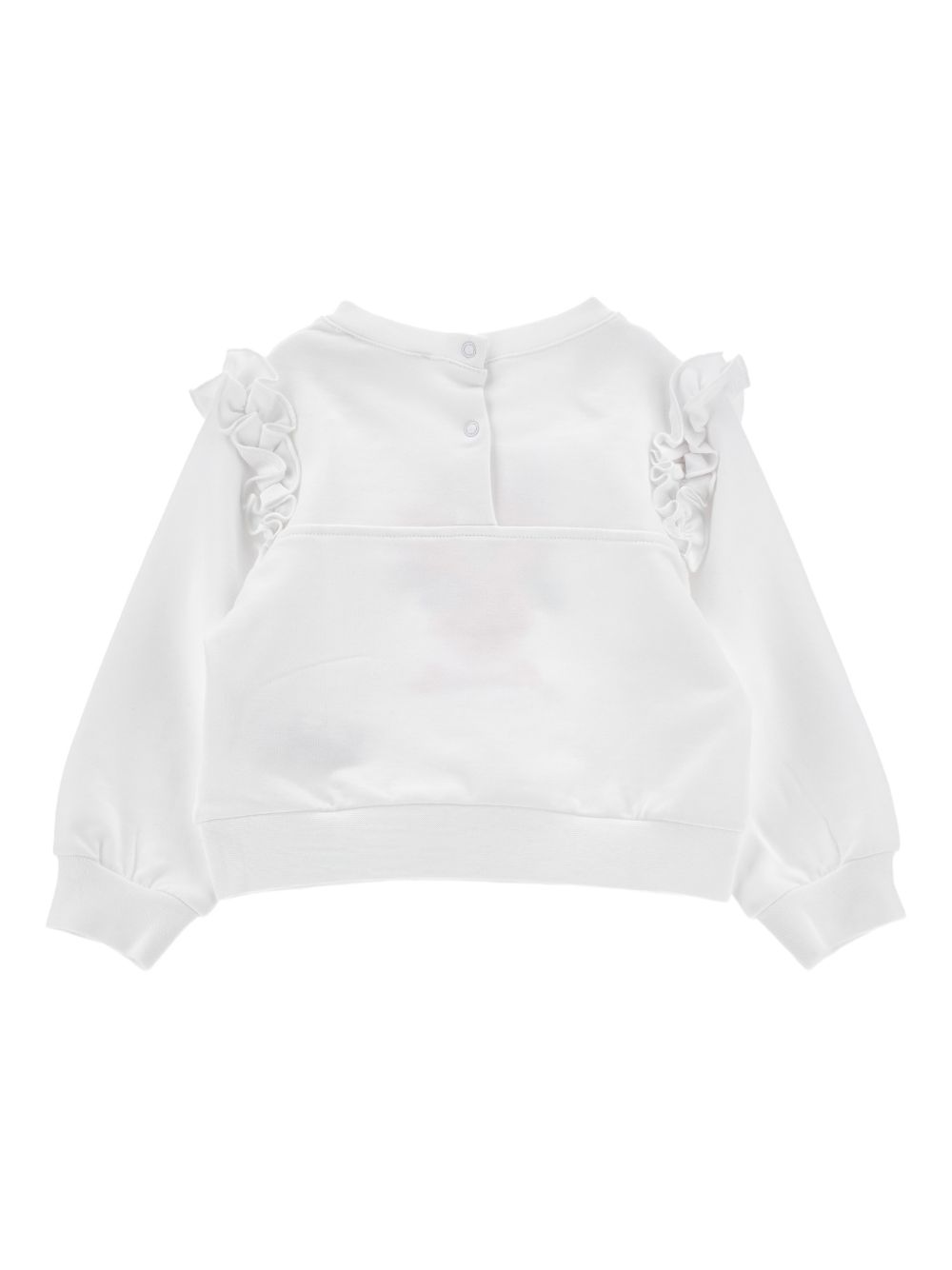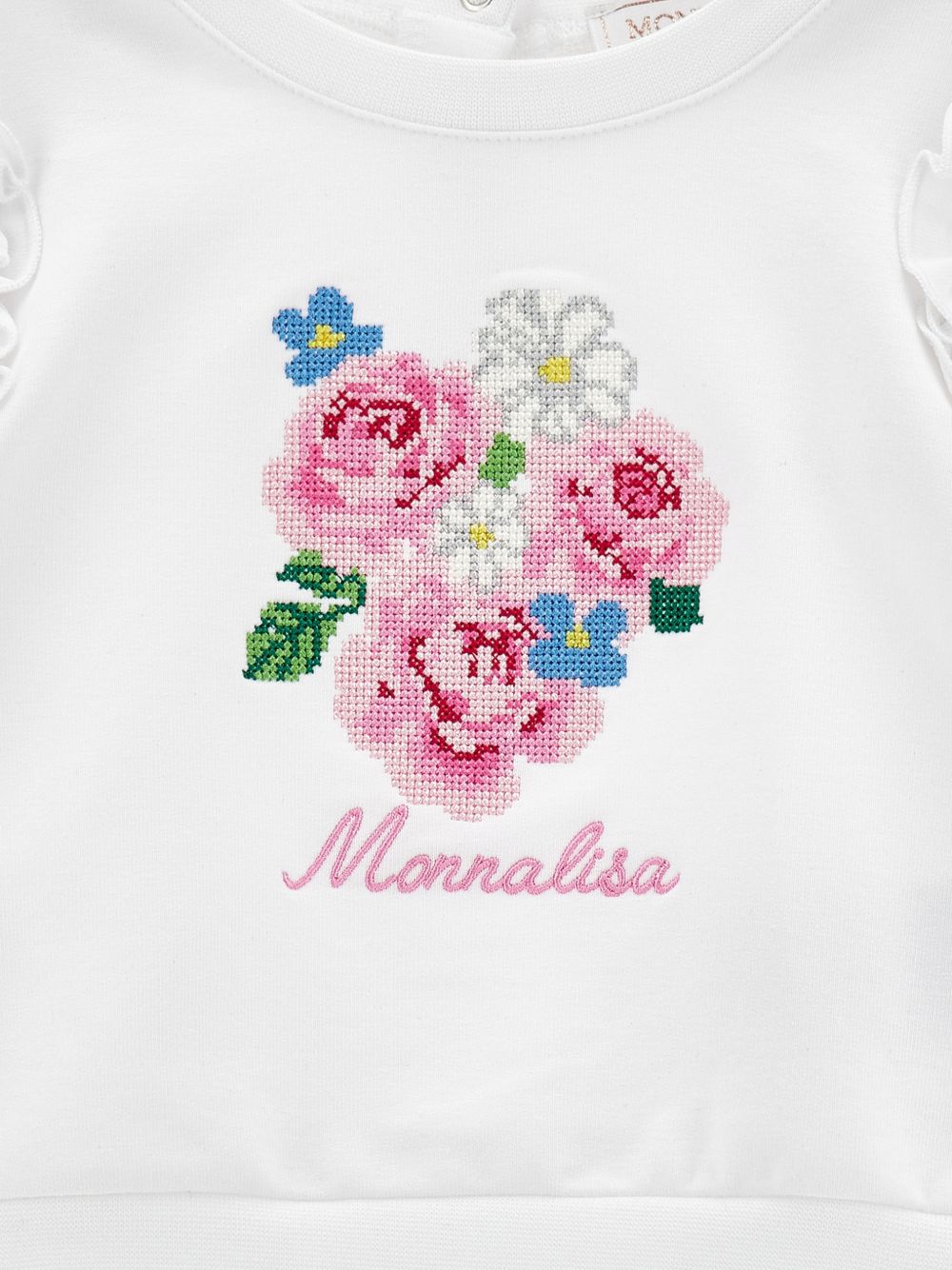 chiusura con bottoni e dettaglio di volant ricamato con fiori bianchi