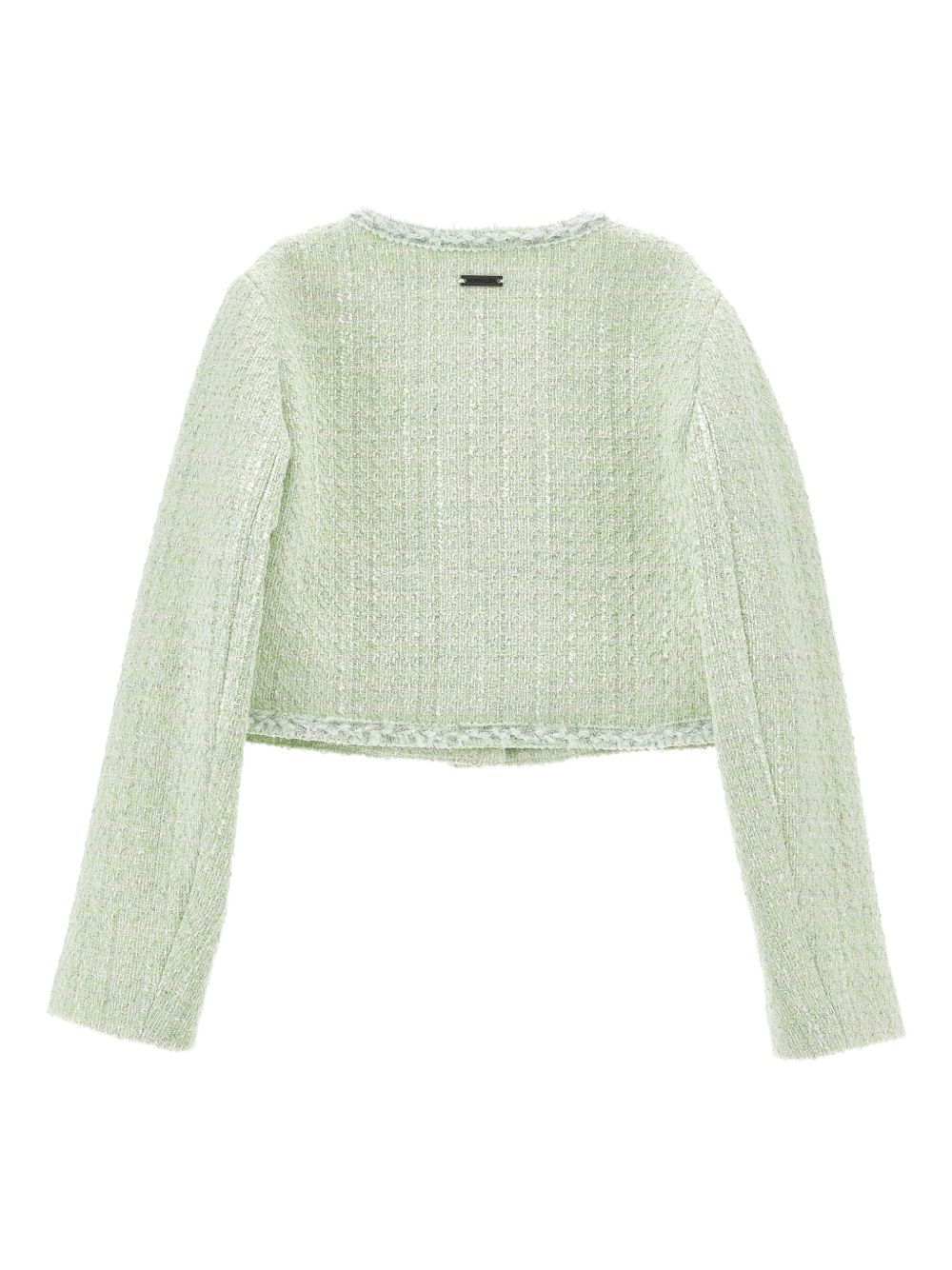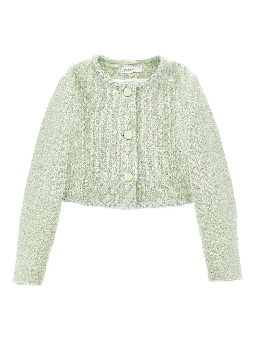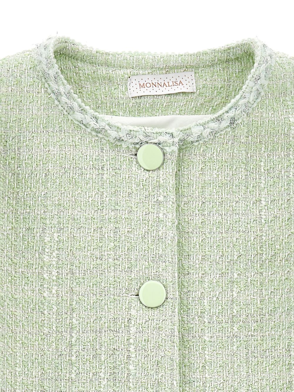 tessuto in tweed verde chiaro, scollo rotondo, chiusura con bottoni, maniche lunghe, finiture intrecciate