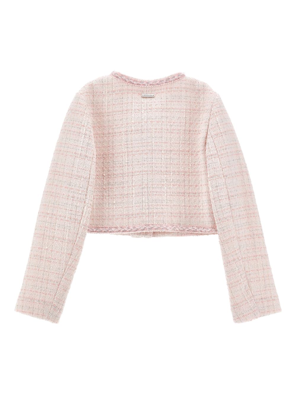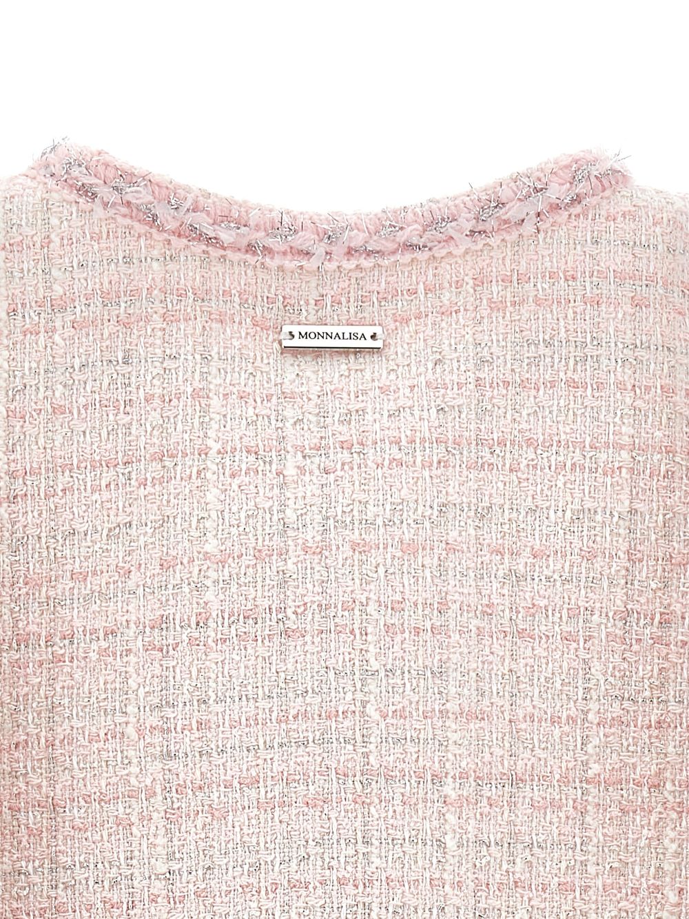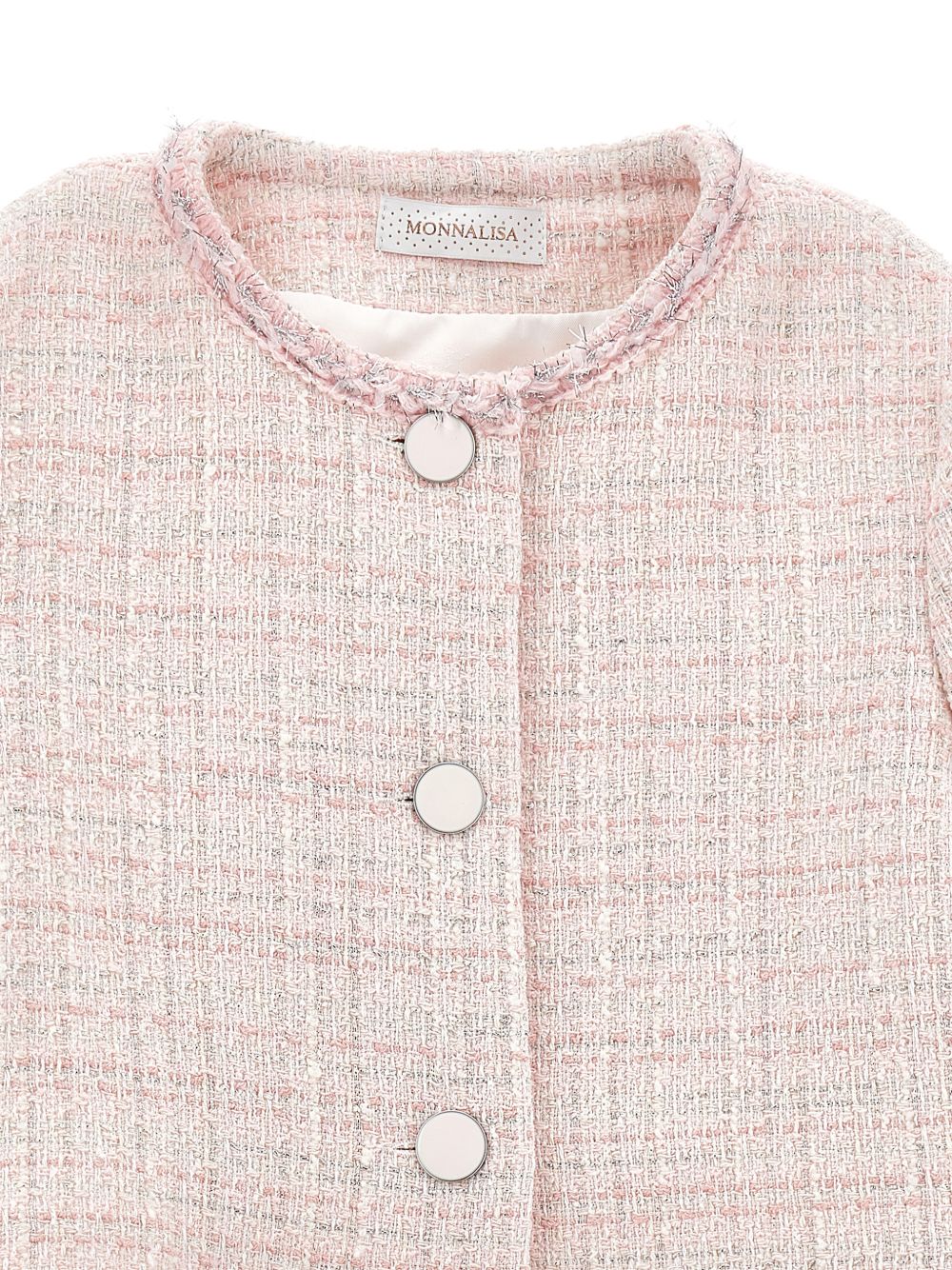 effetto tweed rosa, chiusura con bottoni, finiture sfrangiate, girocollo, maniche lunghe