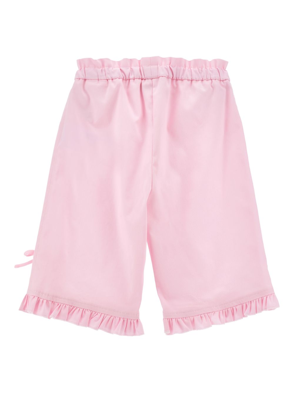 Pantalone con orlo arricciato, rosa, dettaglio fiocco, elastico in vita, dettaglio cuore, due tasche posteriori applicate