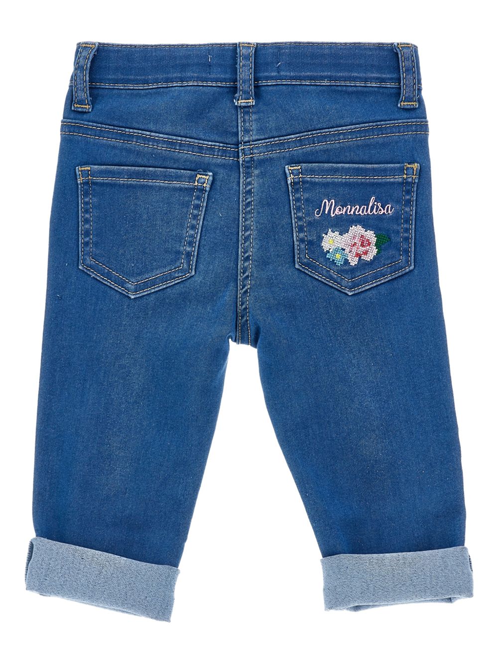 polsini con risvolto ricamati con fiori blu, cinque tasche, passanti per cintura con logo ricamato