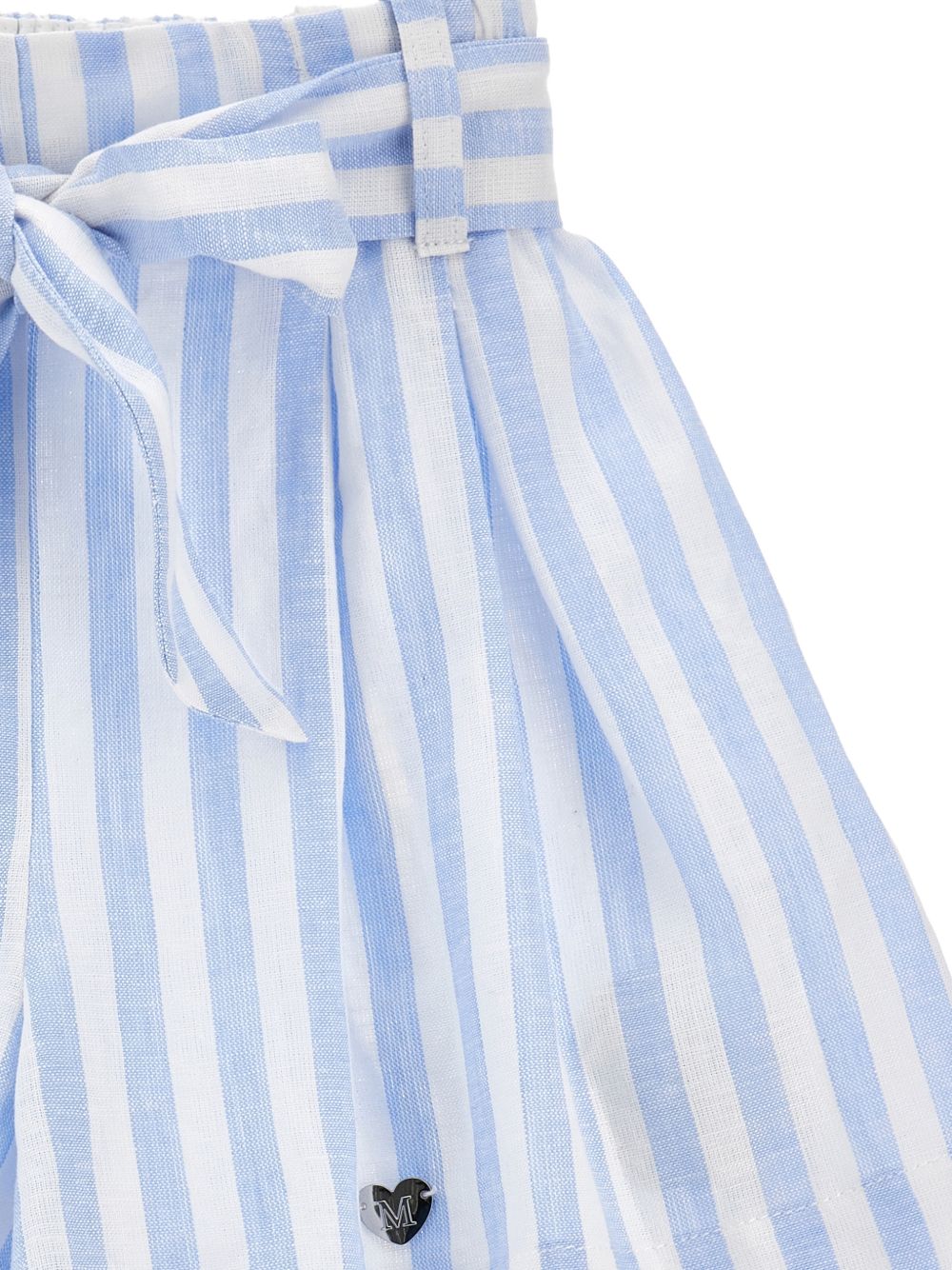 Shorts in misto lino e viscosa, a righe bianco e celeste con dettaglio cintura