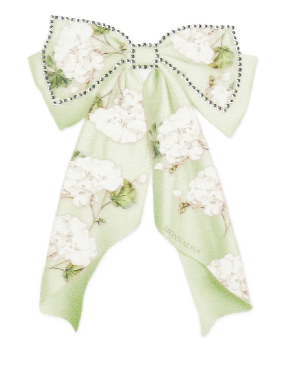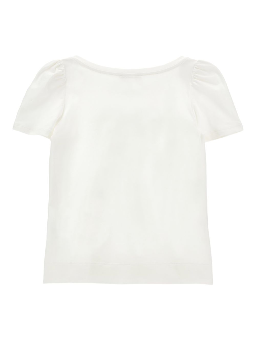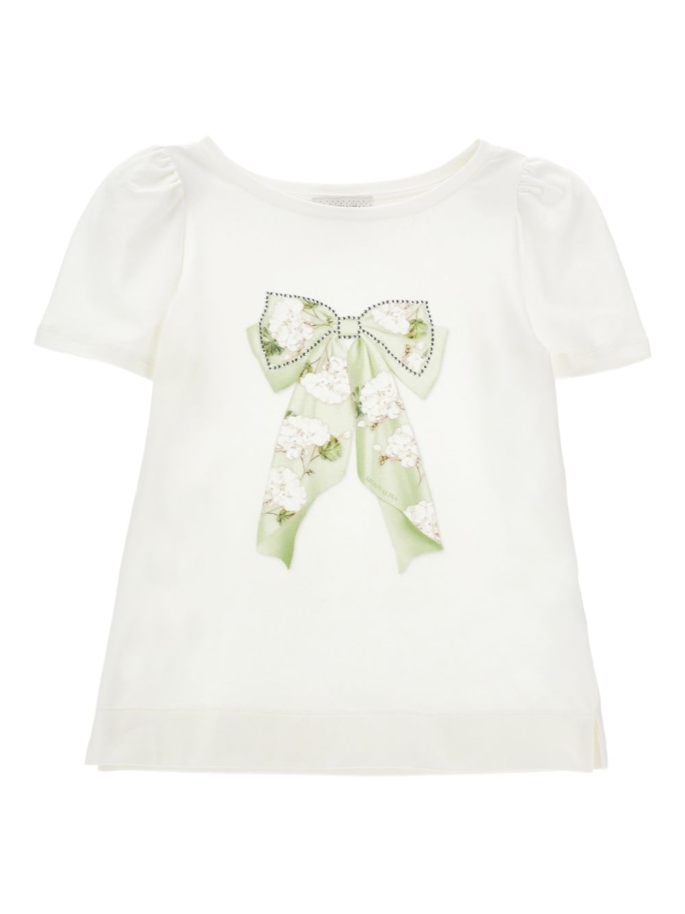 girocollo a maniche corte con stampa floreale bianca, fiocco, borchie e dettagli decorati