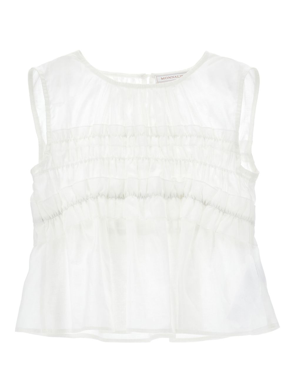 Top bianco con dettagli arricciati, placca con logo, senza maniche, scollo rotondo