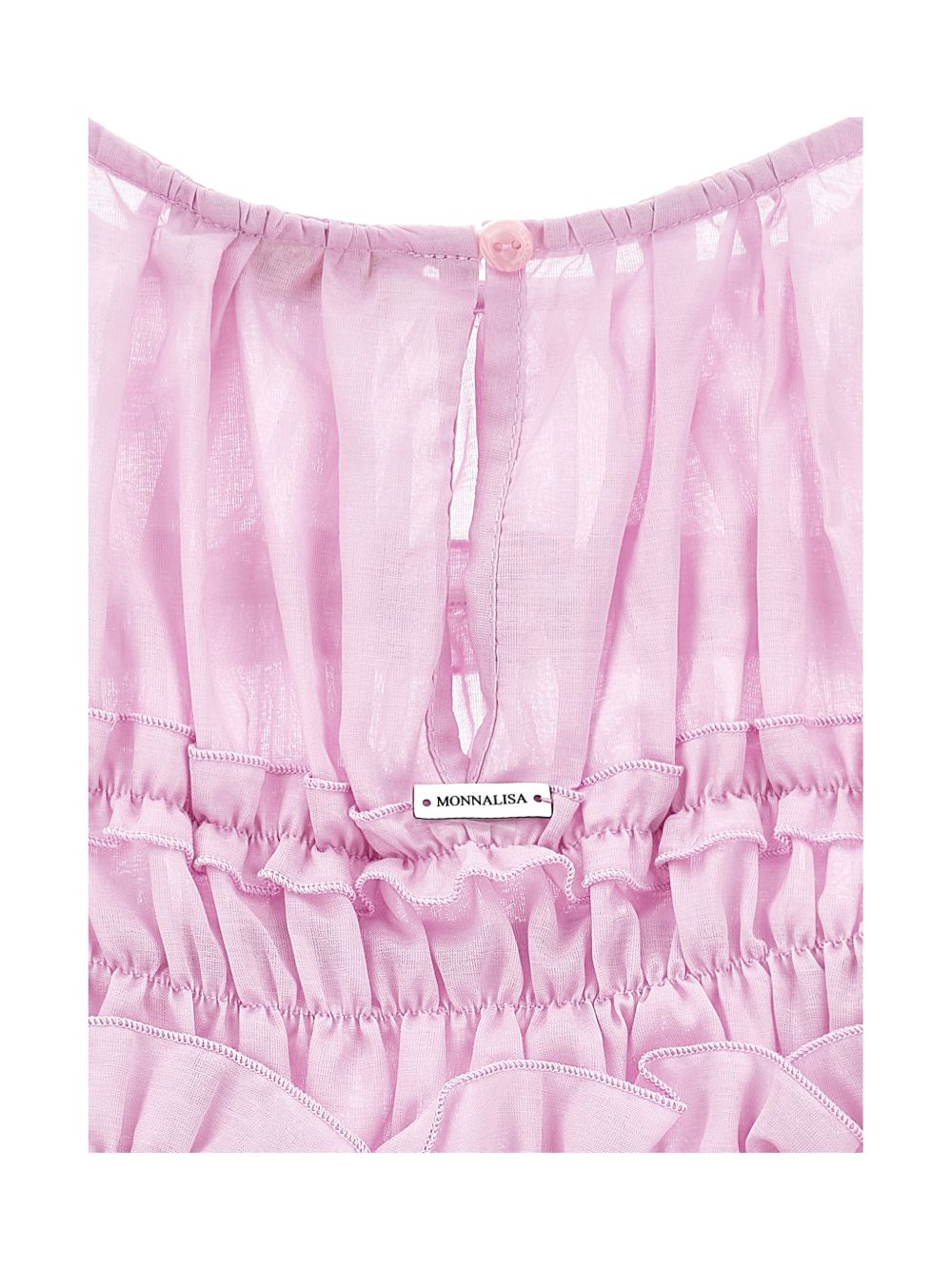 Top lilla con dettagli arricciati, placca con logo, senza maniche, scollo rotondo