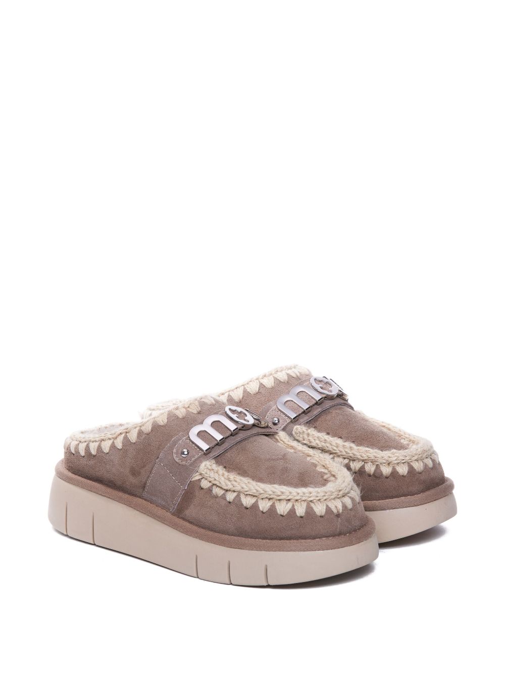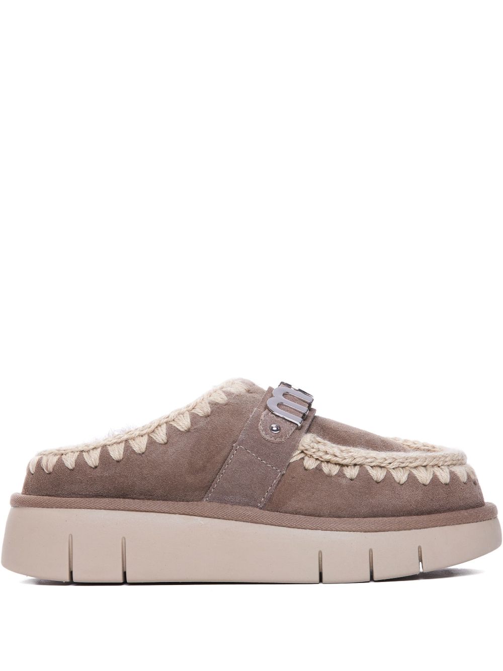 Slippers con fibbia logo, plateau, rifiniture crochet, design slip-on, grigie, pelle scamosciata.