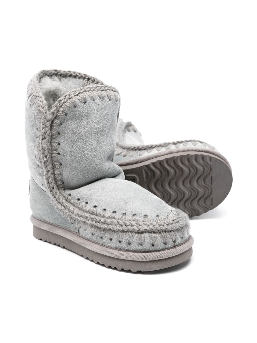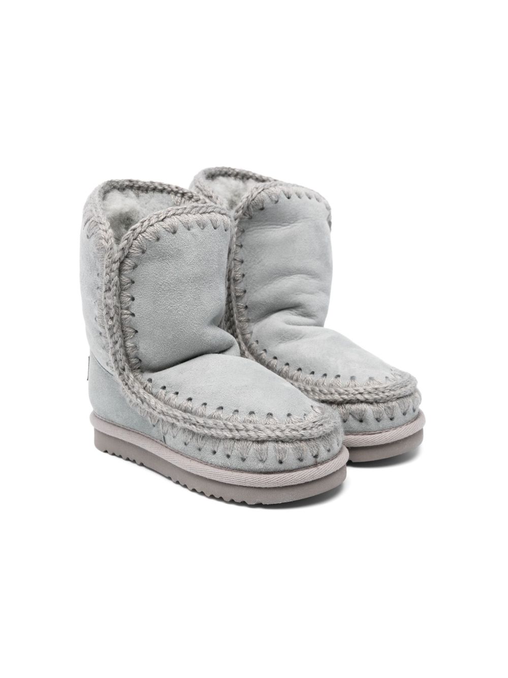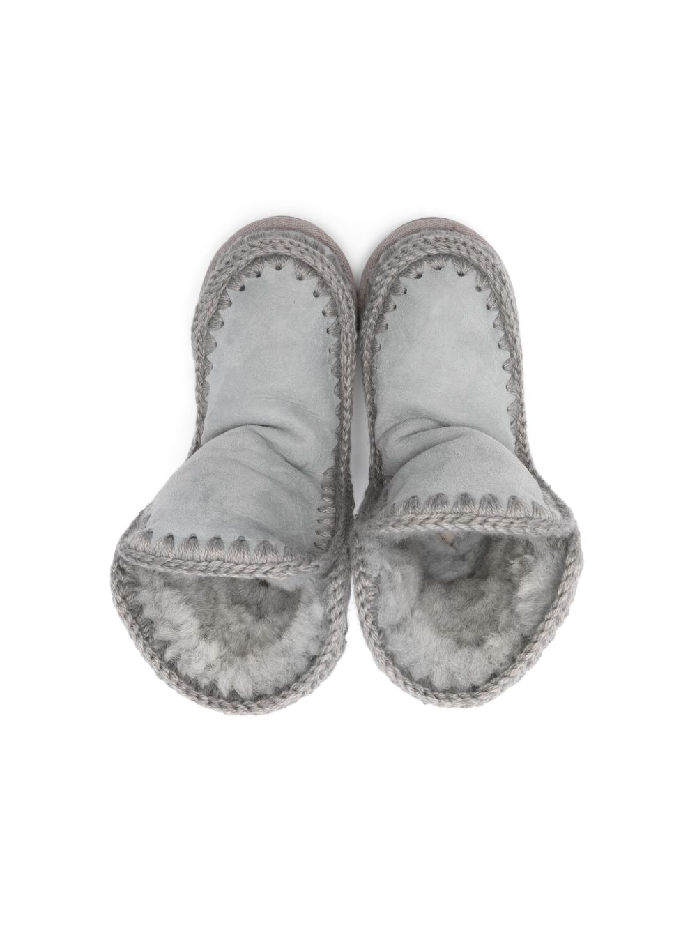 Stivali in pelle scamosciata di vitello blu-grigio, stile slip-on, rifiniture con impunture, toppa con logo sul retro, punta tonda, suola piatta in gomma, fodera in shearling, lunghezza alla caviglia.