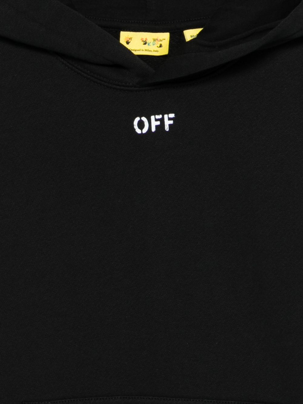 dettaglio pennellata nera tasca a marsupio sul davanti maniche lunghe orlo a coste polsini a coste